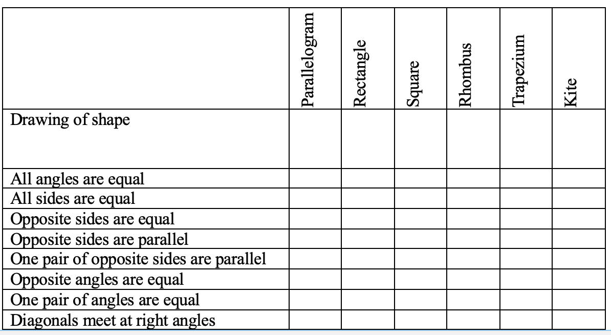 • Introduce the definition and explore the features of different quadrilaterals with the following table. Draw a parallelogram, a rectangle, a square, a rhombus, a trapezium and a kite in the first row. Ask students to investigate one shape at a time and write yes or no in the following rows. Encourage students to check their answers with a classmate and discuss any differences.