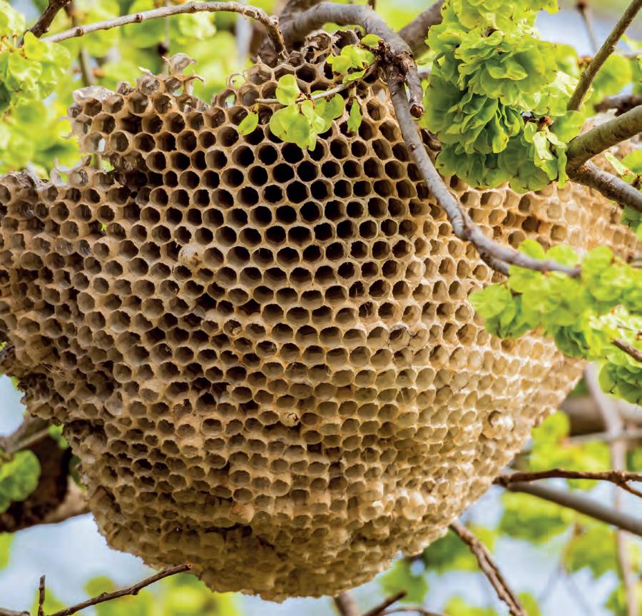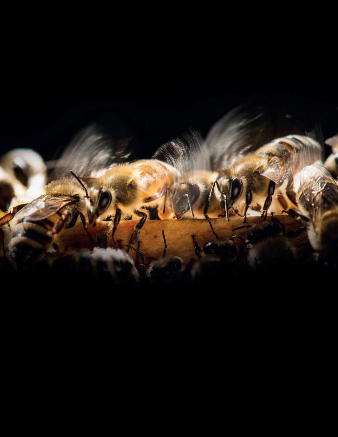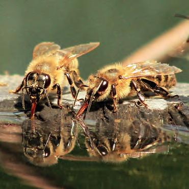 When the bees return with the water, they put it around the hive. Then they f lap their wings to dry the water. As the water dries, the bees are successful : the hive is cooled.