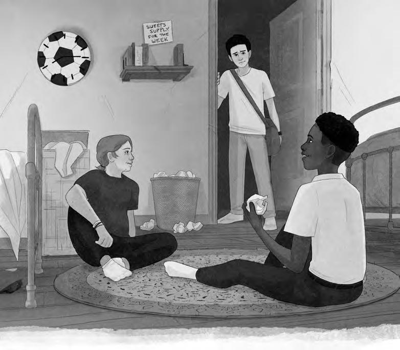 The dorm was full of books (mostly history and mysteries), stuffed toys and a football-shaped clock. Crisp and biscuit wrappers were littered around Max’s bed. Christophe’s bed was expertly made. A bag of marshmallows had been placed on the pillow of the third bed in the room.