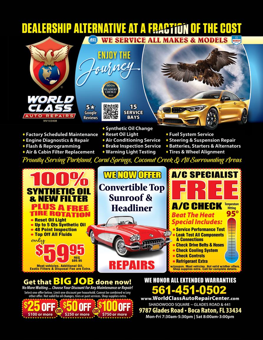 Our City Coral Springs / May 2024 / OurCityMedia.com / 33 Call Your Our City Media Representative Today! ADRIENNE COLLINS 954-817-2259 adrienne@ourcitymedia.com READY TO ADVERTISE? See Our 5 Star ★★★★★ Reviews on YELP and Google 954-345-7887 CORAL SPRINGS AUTO PLAZA 11590 WILES ROAD • CORAL SPRINGS (South East of Coral Ridge Drive) www.DrBrakesUSA.com FAMILY OWNED AND OPERATED SINCE 1995 1000’S OF SATISFIED CUSTOMERS PROFESSIONAL SERVICE AT A FAIR PRICE DR. BRAKES Complete Auto Center WE DO IT ALL! LIC#AR1041 General Repairs · Tires & Alignment · Computerized Diagnostics · AC Service · CV Axles & Front End · Brakes Suspensions · Tunes ups · Engines · Electrical 2023