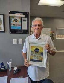 Artist Marilyn Johansen presented her portrait of Ed Morse—a decorated lieutenant and aviator in World War II who founded the now-national Ed Morse Automotive Group in 1946—to his grandson, Teddy, who was in attendance.