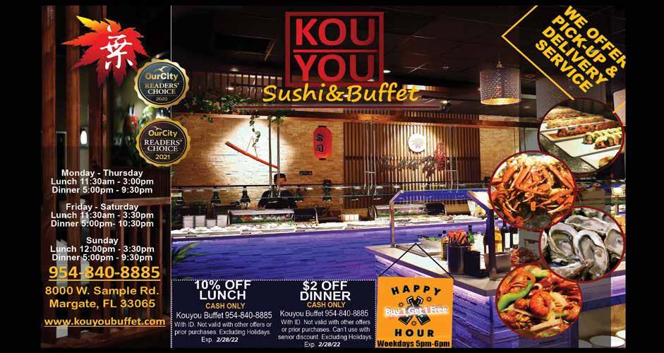 READER’S CHOICE FAVORITE FOR PLUMBING SERVICES PLUMBING REPAIRS • LOCATE LEAKS • WATER HEATER • REPAIR TOILETS OC 3/20 SERVICE CALLS AVAILABLE • SAT. & SUN. 9:00AM-4:00PM AT NO EXTRA COST OPEN 7 DAYS $6800 OFF $10000 OFF $8800 OFF 50% OFF TUNNEL EXPERTS Any new Toilet Save Until You Need Us Not valid with other offers or prior services. Limit one coupon per service call. Any new Water Heater or Tankless Heater Not valid with other offers or prior services. Limit one coupon per service call. Any new Water Sewer Lines Save Until You Need Us Not valid with other offers or prior services. Limit one coupon per service call. By State-Of-The-Art equipment. Up to 12 FT. Second Toilet Repair Save Until You Need Us Not valid with other offers or prior services. Limit one coupon per service call. We dig tunnels under buildings & houses to replace water or sewer lines. No need to leave your home! WE DO NOT Cut Your Floors South Florida’s BIGGEST & BEST 954-786-0477 Licensed & Insured CFC1427238 CGC1508546 O C M 12O C M 12O C M 12O C M 122022 BEST OF PLANTATION 2022 2022 2022 BEST OF PEMBROKE PINES 2022 $6800 OFF $6800 OFF Cleaning any sink, toilet, laundry or sewer drain. Save Until You Need Us Not valid with other offers or prior services. Limit one coupon per service call. O C M Any new Garbage Disposal Save Until You Need Us Not valid with other offers or prior services. Limit one coupon per service call. 12O C M 1210% OFF Any Plumbing Work! 100% Satisfaction Guaranteed! www.PlumbingExperts.com Thank you South Florida for over 46 years of your business! O C M 12Not valid with other offers or prior services. Limit one coupon per service call. 2022 2020 Our City Coral Springs / December 2022 / OurCityMedia.com / 17 11850 WILES ROAD CORAL SPRINGS., FLORIDA 33076 • FREE ESTIMATES • APPROVED BY ALL INSURANCE COMPANIES • INSURANCE CLAIM ASSISTANCE • RENTALS AVAILABLE • PAINT MATCHING SPECIALIST • EXPERT FRAME & UNIBODY REPAIRS • ENVIRONMENTALLY SAFE FACILITY SIX BUILDINGS WEST OF CORAL RIDGE DR. NEXT TO KITCHEN ART. “Your Hometown Body Shop” Since 1986 Insured / BC License #71 2022 954-752-4557 Family Owned & Operated LIFETIME WARRANTY! AUTO WORKS COLLISION & PAINT