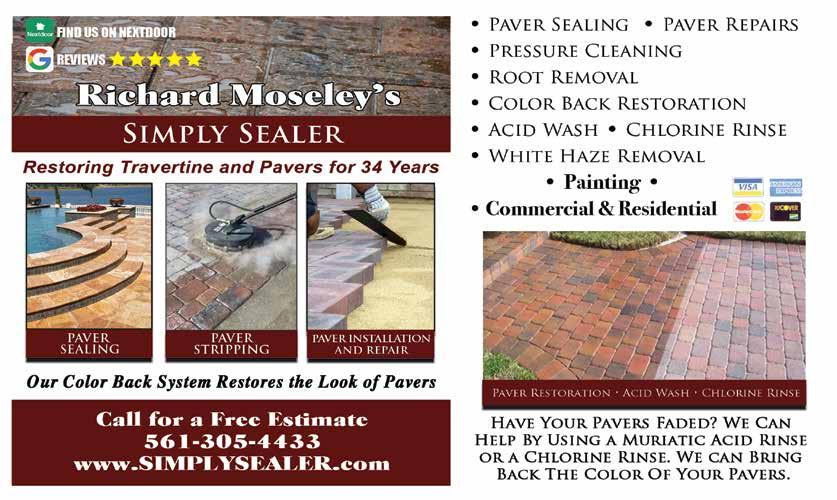 12/31/22 12/31/22 POWER WASHING • SEALING • ANTIQUING • STAINING SERVICES • NON-SLIP TREATMENTS & COATINGS ENHANCE & PROTECT YOUR SURFACES WE CAN TREAT ANY CONCRETE SURFACE, INCLUDING: • Pool Decks • Patios • Sidewalks • Driveways • Balconies • Stucco • Pavers • Garages • Brick •AND MORE! SlipGuardFloors.com Wes@slipguardfloors.com COMMERCIAL & RESIDENTIAL • SERVICING SOUTH FLORIDA • FULLY INSURED & LICENSED CALL NOW FOR A FREE ASSESSMENT! 954-909-5929 ASK US ABOUT CLEANING & RESEALING PAVERS TODAY! PAVER CLEANING & SEALING $200 OFF WHEN MENTIONING THIS AD APPLIES TO JOBS OF $1000 OR MORE BEFORE BEFORE AFTER AFTER AFTER BEFORE NON SLIP TRAVERTINE APPLICATIONS GREAT FOR POOLS! Our City Coral Springs / December 2022 / OurCityMedia.com / 27