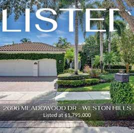 WESTON | WINDMILL RANCH ESTATES | 6 BR + OFFICE - 7.5 BA | WINE CELLAR | NEWER ROOF | $3,495,000 WESTON | BOTANIKO | LAKE VIEWS | CORNER LOT | 5 BR + DEN & 6.5 BA | $2,900,000 OFFERACCEPTED MIAMI | BRICKELL | POOL AND BAY VIEWS | RENOVATED | 2 BED + DEN & 2.5 BATHS | $2,445,000 LAUDERDALE BY THE SEA | PARTIAL OCEAN VIEWS | 2 BR + DEN & 2 BA | $1,050,000 FORT LAUDERDALE | L’HERMITAGE | OCEAN VIEWS | 2 BED + DEN & 3.5 BATHS | $2,150,000 KEY BISCAYNE | THE PALMS | 2 BR - 2 BA | RENOVATED | $950,000 SUNNY ISLES | 1 BD - 1 BA | RENOVATED | OCEAN & INTRACOSTAL VIEWS | $273,000 FORT LAUDERDALE | THE OASIS | 2 BR - 2 BA | WATER VIEWS | $489,900 OVER ONE BILLION DOLLARS IN SALES 3000+ DORAL ISLES | RENOVATED | 3 BR - 2.5 BATHS | LAKE VIEW | $750,000 DORAL | 3 BR - 2.5 BA | GREAT LOCATION IN DOWNTOWN DORAL | $745,000 Over 37 YEARS of Experience, Integrity, Commitment & Proven Approach UNDERCONTRACT