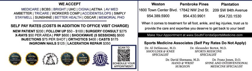 954-384-8484 Se Habla Español 2625 Executive Park Dr, Suite 2 Weston, Florida 33331 DR. DIANA TORRES • Personal treatment by Dr. Diana Torres • 0% interest in office payments plans • Call for a complimentary video consult • Cosmetic & Preventative Dentistry • Dental Implants • Veneers www.FamilyDentistryInWeston.com Available for Dental Emergencies & Virtual Consultations 2022 GET THE SMILE YOU LOVE FOR A SPECIAL PRICE TODAY! A BEAUTIFUL SMILE IS NOW MORE AFFORDABLE THAN EVER! ALL-Inclusive Invisalign whitening included EXP. 12/31/2022 $3399