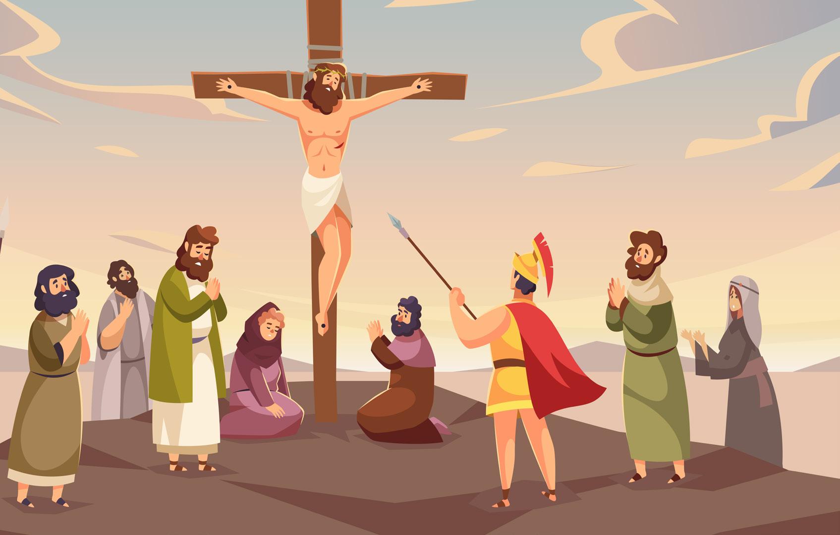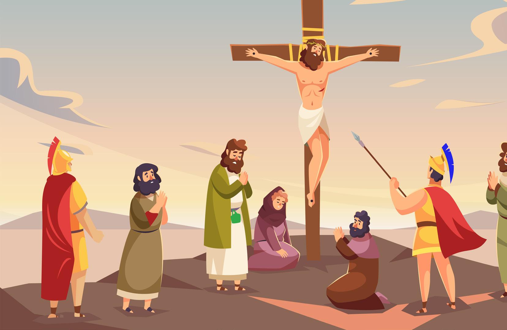 於是彼拉多把耶穌交給他們去釘⼗字架。他們把耶穌帶去 了。耶穌 自己 背著⼗字架出來,到了⼀個名叫「髑髏」的 地 方 ,希伯來話叫各各他。他們就在那裡把耶穌釘在⼗字 架上;和祂⼀同釘⼗字架的,還有兩個⼈,⼀邊⼀個,耶 穌在中間(約翰福⾳ 19 章 16 - 18 節)。