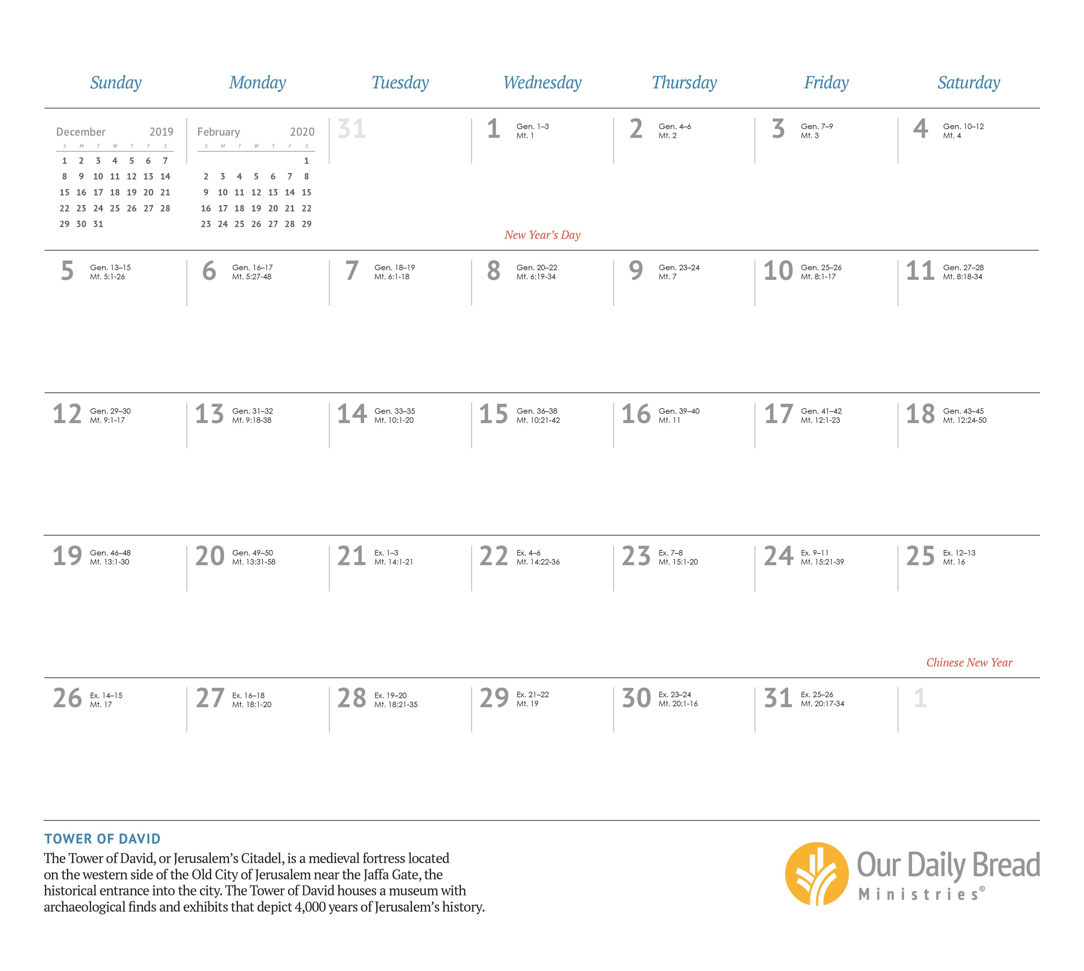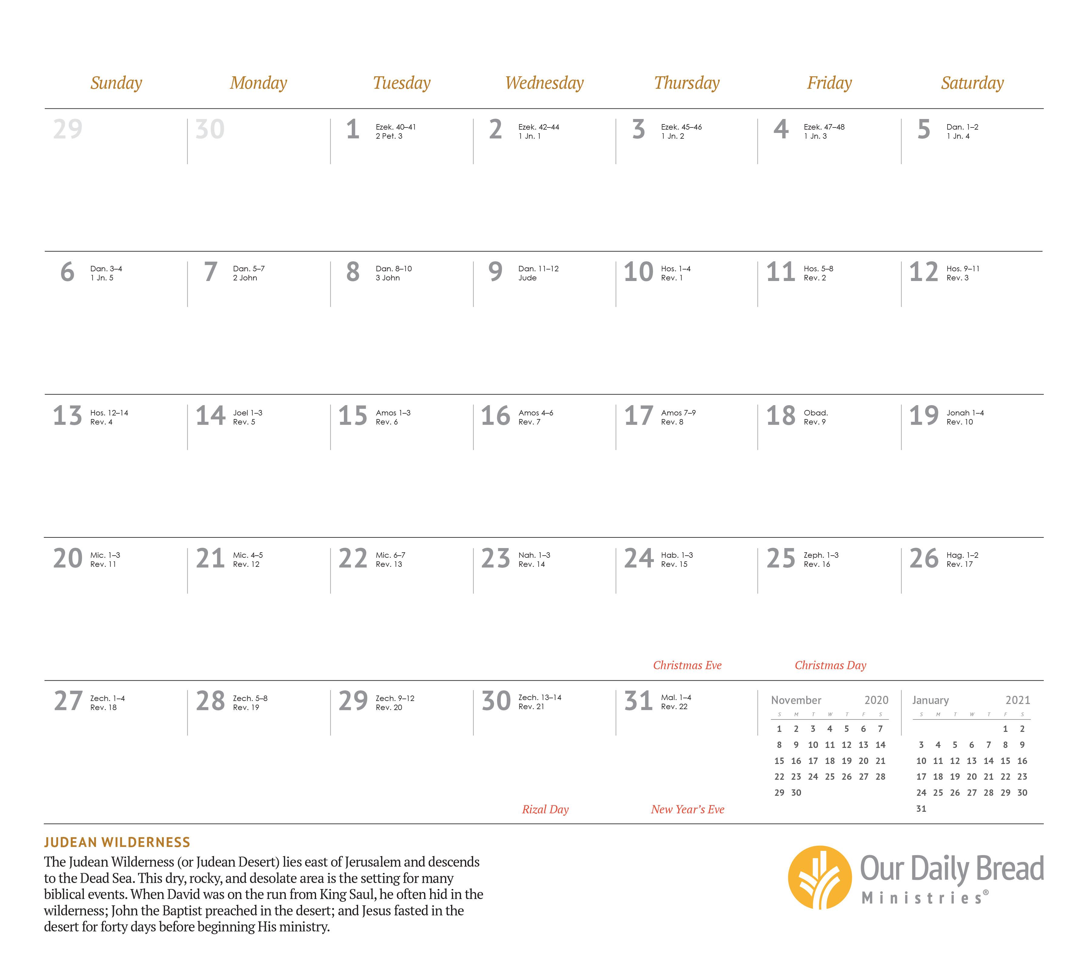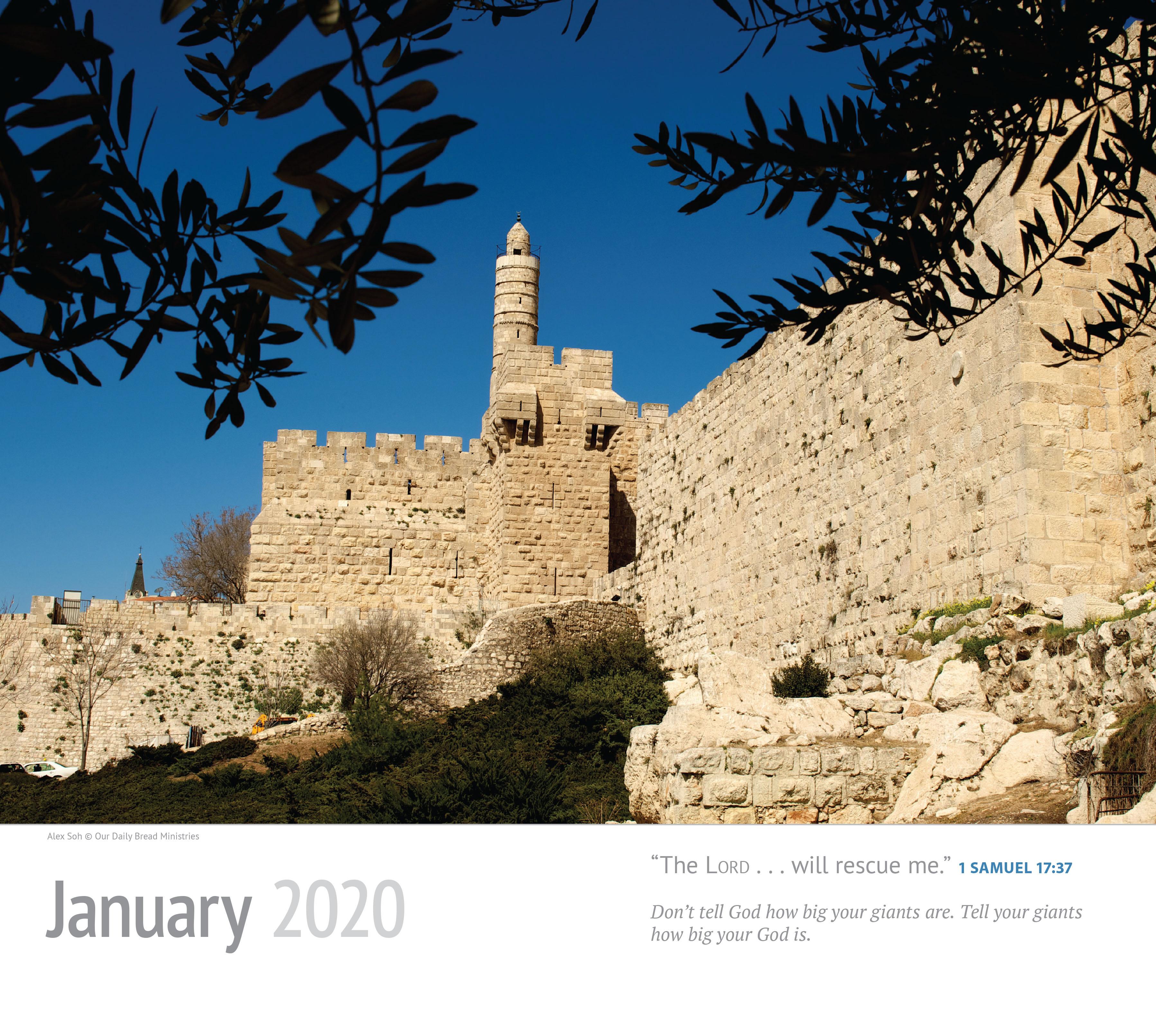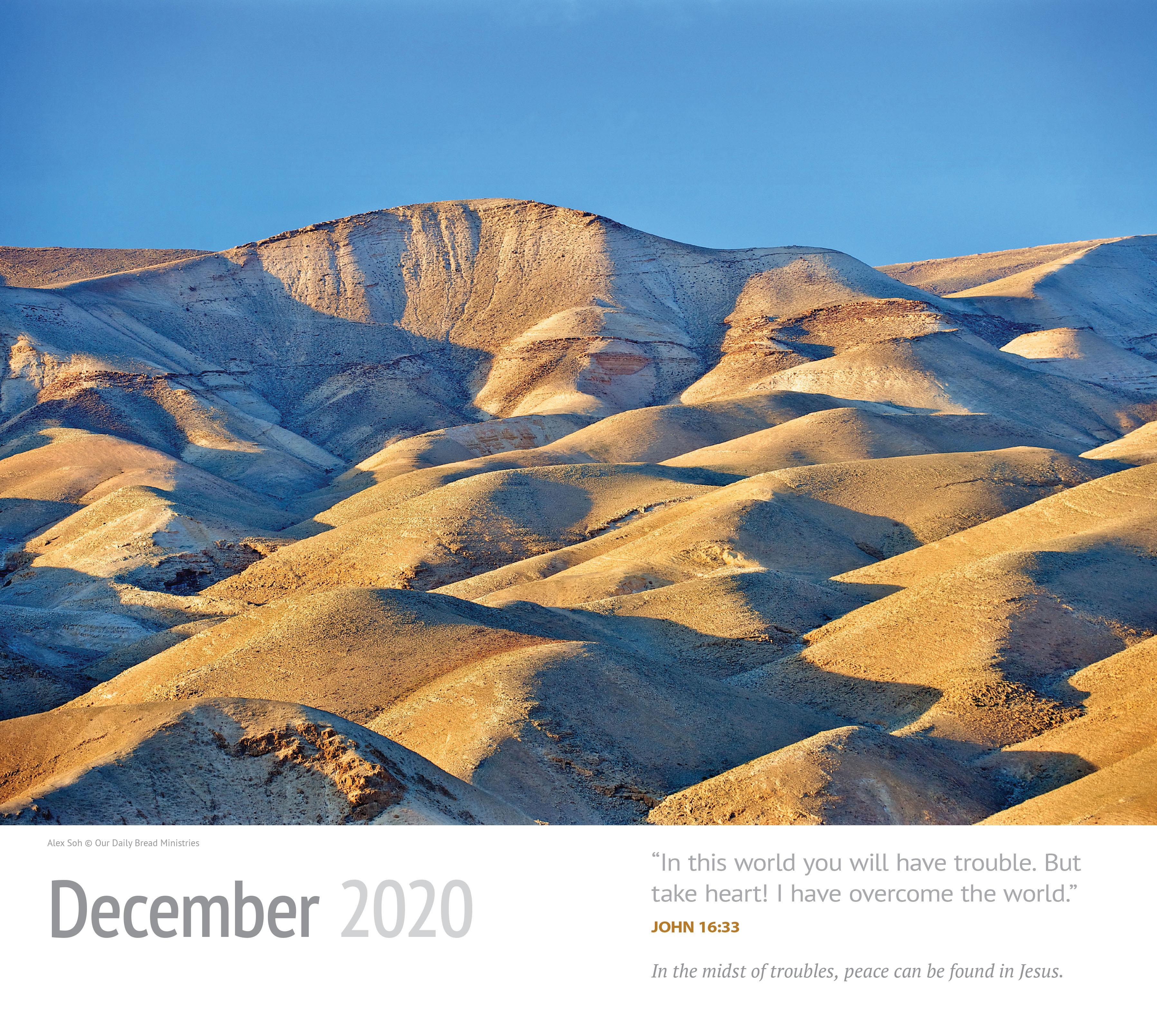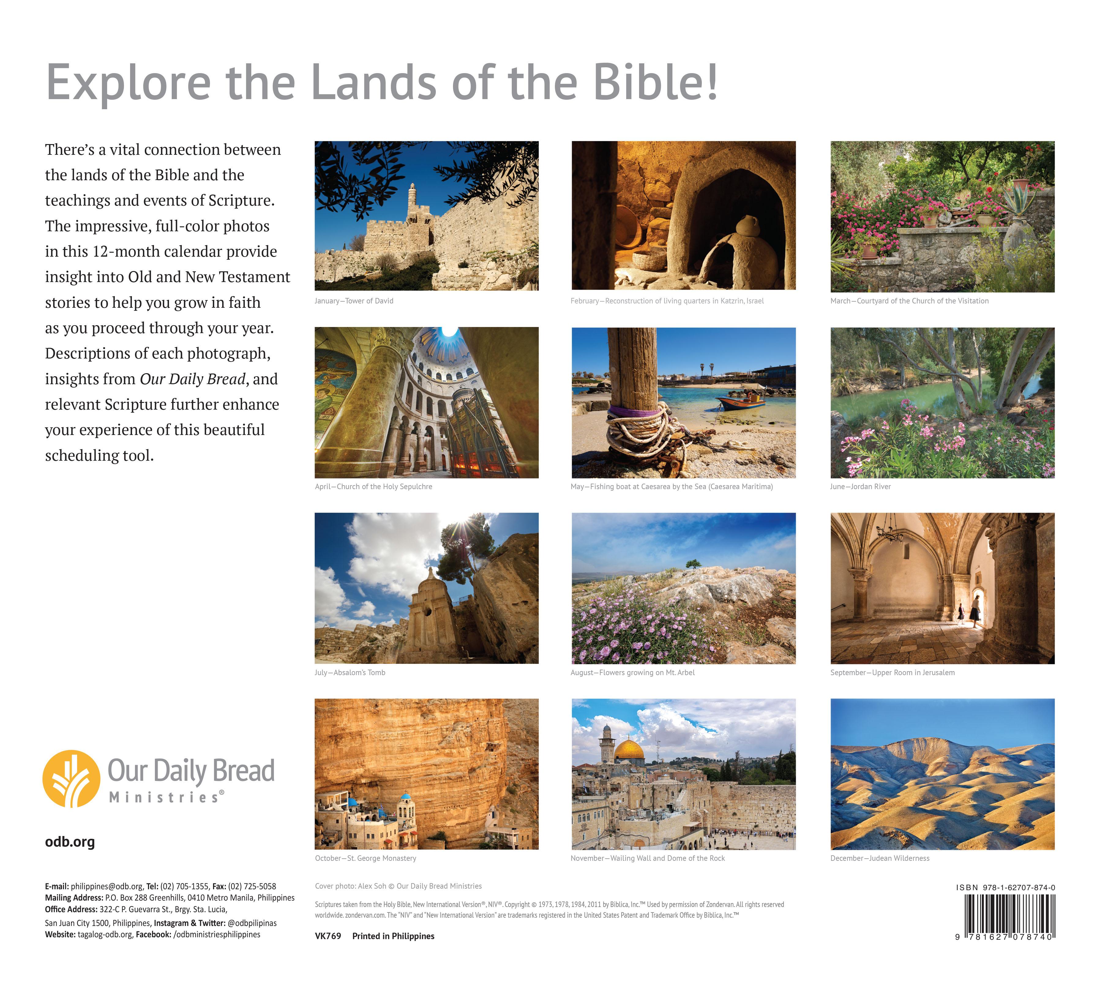 There's a vital connection between the lands of the Bible and the teachings and events of Scripture. The impressive, full-color photos in this 12-month calendar provide insight into Old and New Testament stories to help you grow in faith as you proceed through your year. Descriptions of each photograph, insights from Our Daily Bread, and relevant Scripture further enhance your experience of this beautiful scheduling tool.
