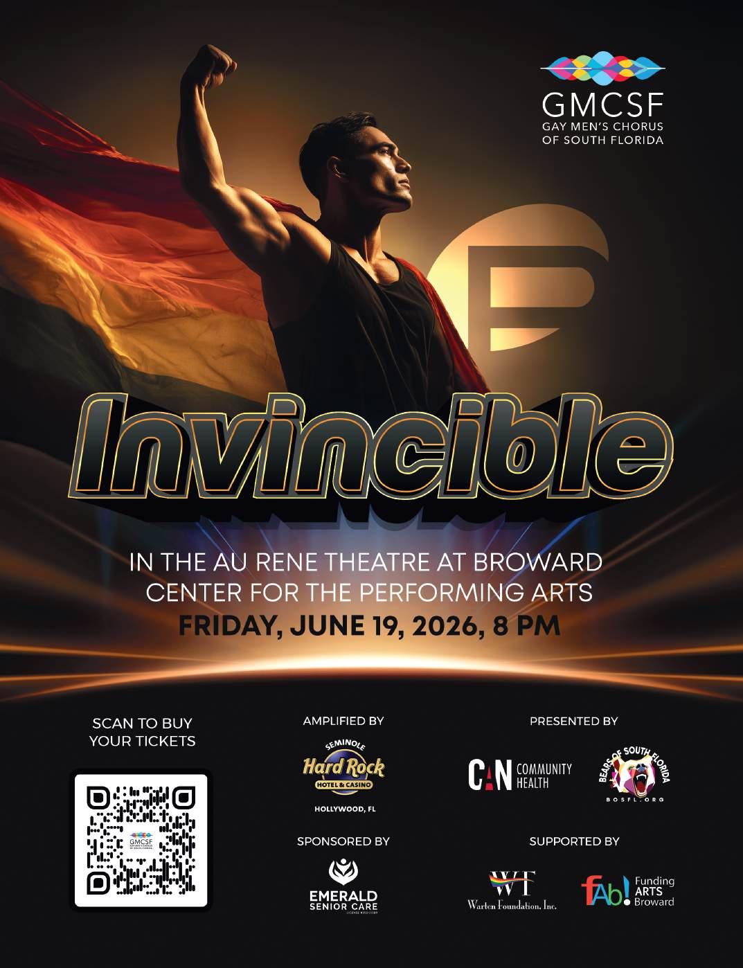 Invincible is sponsored by Seminole Hard Rock Hotel & Casino Hollywood, CAN Community Health, The Bears of South Florida, and Emerald Senior Care, with additional support from the Warten Foundation and Funding Arts Broward.