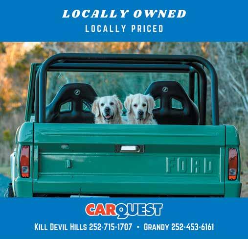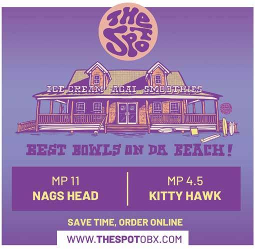 • Get loopy. Fly high. Maybe puke up some corn dogs and cotton candy. It’s all fun and laughs for the Children & Youth Partnership for Dare County, when June 5-8’s Soundside Fun Fair raises funds via carnival rides, concessions and games. 5-11pm. Free to attend. Single tix are $1.50; 20 for $25. All you can ride: $30. Get weather updates and more on Facebook. • Celebrate a half-century of saved dunes and sandy shoes, June 5-8, when the 50th Anniversary Celebration of Jockey’s Ridge State Park piles up four days of educational programs and recreational competitions — plus a first ever Drone Show, and concerts by The Connells and Mojo Collins. Find a complete calendar at www.jockeysridge50.com. • Live music and stunning skies steal the show every Thurs. at Sanctuary Vineyards’ Acoustic Sunsets. From 5:30-8:30pm, catch free concerts by bands like Manteo Murphy (June 12), Soul One (July 24), or The Mo-Rons (Aug. 28), plus tasty beer, wine and food for purchase — where 10% of sales support local non-profits. Find details at www. sanctuaryvineyards.com. • Or enjoy a sampler platter of strumming singers six days a week at Blue Moon Beach Grill, such as The Bar Cats (Wed.), Jeremy Russell (Thurs.), Kamea Blake (Fri.), Gerry Maddox (Sat.), Brad Privott (Sun.), and Bryan Campbell (Mon.). Learn more at www.bluemoonbeachgrill.com. • Meanwhile, The Blue Point puts the “sound” in “sound view” with weekly waterfront performances by The Twin Fins (Wed.), Kamea Blake (Thurs.), Bird Dog (Fri.), and Harry Harrison (Sat.). And every other Mon., the Good Wine Club invites would-be oenophiles to taste and talk tannins with top sommeliers. Visit www.thebluepoint.com for a full calendar. • Jack Brown’s weekly mix was a work-inprogress at press time, but here’s what they’ve nailed down so far: The Ramble (Mon.) and Shane Thomas (Tues.) are in the backyard from 7pm-10pm; OBX Silent Disco is inside on Thurs., along with live local bands on Fri. & Sat. (all 10pm-1am). And Sun. will rotate between DJ Josh Prairie’s Magic Cabana Time out back from 7-10pm, and Karaoke Nights inside from 10pm-1am. Follow @jackbrownskdh for the finishing touches. • KDH’s Swells’a Brewing will serve the bubbly rhythms of Suzie Jacuzzi on Sun., and the intoxicating hijinks of Harry Harrison on Thurs. — plus a range of home-brewed bands on select Fri. & Sat. (Get an earful of Hot Sauce on June 20.) Meanwhile, the Duck Dive Bar will belt out music every Mon.-Fri., including more local faves like Frozenhead & The Squirrels (July 15) and PSPSPS (Aug. 12.) All of them play 6-9pm. Follow @swellsa_ brewing and @swellsa_duck_dive for freshest deets. • Meanwhile, the Outer Banks Brewing Station offers breezy backyard concerts every eve from 5:30-8:30pm. (Weather permitting.) And the inside gets wild — and goes late — as Wed.’s Ladies Night with DJ Bruce and Fri.’s Dance Night with DJ Smilez both boogie ‘til 2am. Then, on Thurs. & Sat.,