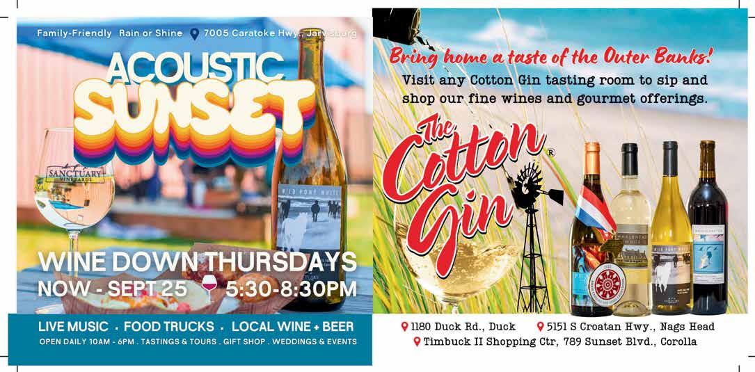 • On Aug. 6, treat yourself to a DIY beer or wine flight — while seeing local creators soar to new heights — when the Corolla Cork & Craft brings curated local craft artisans to the breathtaking setting of Historic Corolla Park, and sells local vino and suds to anyone 21+. 12-8pm. See www.visitcurrituck.com for specifics. • On Aug. 7, savor the soulful, potent sounds of Alabama’s Muscadine Bloodline, when Live from OBX serves ’em up at Roanoke Island Festival Park. 6:30pm. More at www. livefromobx.com.