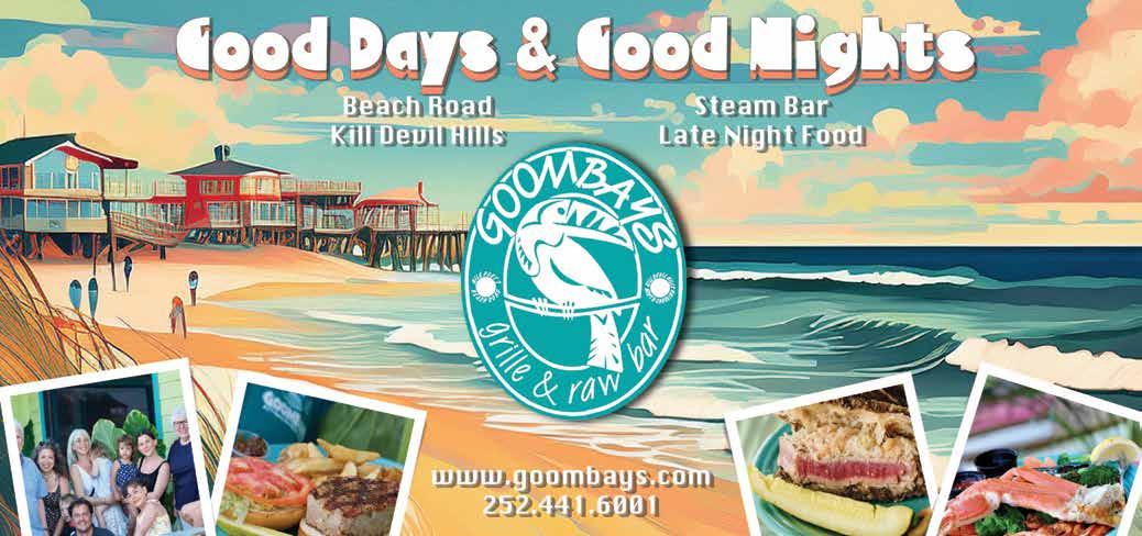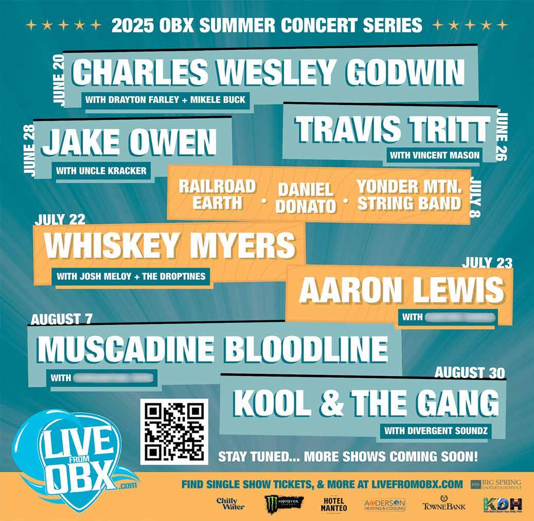 Memorial Youth Fishing Tournament introduces anglers aged 4-to-16 to the joys of catch-and-release competitions. (Sign-ups at 7am.) Come noontime, everyone dashes to Jennette’s Pier for an awards ceremony from 12-2pm. Find Nags Head Surf Fishing Club on Facebook for updates. • And jogging’s “off the hook” all summer in Nags Head. Starts every other Thurs. when the 2025 Outer Banks Sunrise 5k /1 Mile Beach Race Series hops between Jennette’s Pier (June 12, July 10, & Aug. 7) and the Epstein Street Beach Access (June 26, July 24 & Aug. 21). Or, stick to the west side with the Village Realty 5K/1 Mile Road Race Series, June 19, July 17 & Aug. 14. 8am starts. Walk-up registration at 7am. Get pricing and more at www.obxrunning.com • Then shop ’til you drop every Thurs., June 12-Aug. 21, at Dowdy Park’s Summer Farmer’s Market! From 9am-1pm, you’ll find everything from candles and crafts to pottery and produce. (Be sure to stop by the Outer Banks Health tent for recipes and samples that encourage folks to Eat the Rainbow.) And come back for a full spectrum of weekly events, including: Fitness Fridays (June 13Aug. 22; 7:30-8:15am); Wed.’s Summer Concert Series (June 18-Sept. 3; 6:30-8pm); and Tues.’s Family Fun, a mix of performers and variety shows (June 24-Aug. 19; 10-11:30am.) Then it’s Fido’s turn to shmooze and sniff butts when Nags Head Dog Park hosts Yappy Hour every Wed., June 25-Aug. 6. 10-11am. Get weather updates and more on Facebook Music