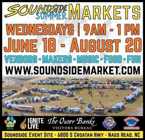 hounds will love Town of Duck’s Concerts on the Green, where local and regional bands rock the stage for free every Thurs., June 12-Sept. 11. (6:30-8pm). Plus, the new Duck Unplugged series brings stripped down acts to the Duck Amphitheater select Tues. eves at 6pm, including Kim Kalman (June 24), MaryAnn Toboz & Bruce (July 29) and Haze & Dacey (Aug. 26). And no two acts are the same when Variety Shows play Duck Amphitheater at 10am on select dates, including: RePercussion (June 17); Ivan Pecel: Making Juggling Tolerable (July 8); Jef Lambdin’s Holiday Shenanigans (July 23); Wacky Chadd (July 29), and Soap Bubble Circus (Aug. 12). All events are free and open to the public. Find more info — and even more weekly events — at www.ducknc.gov • Wanna let the kids run a little wild — while learning about the natural world? Try Elizabethan Gardens’ Camp Discovery, where four weekly outings mix age-appropriate activities with lessons on local ecosystems and plant and animal species: Ages 4-7 (June 1620 & July 7-11; 9am-1pm); Ages 8-12 (June 23-27 & July 14-18; 9am-3:30pm). Registration includes a t-shirt, snacks, bottled water. BYOBL (Bring your own bag lunch.) Plus, Butterfly Releases will lift-off every Wed. & Fri. through Aug. at 10am & 2pm. Get details and ticket info at www.elizabethangardens.org • Or take the little braves to Frisco Native American Museum & Natural History Center, where summer programs happen every day at 11am & 2pm, starting June 17, including: Native Games (Fri.), Scavenger Hunts (Sat.), and Native Videos (Sun.). Plus, Tues. & Thurs. feature a range of speakers and demonstrations regarding indigenous life and local history. Free with admission. Hours, pricing and updates at www.nativamericanmuseum.org • Get blissfully lost in breathtaking beauty when Corolla’s Under the Oaks Art Festival returns June 17-18. From 10am-5pm, wander freely along Whalehead’s front lawn, enjoying a mesmerizing selection of photos and paintings, woodwork and pottery — plus lots of dazzling food, drink and tunes. More at www. visitcurrituck.com. • Be sure to schedule a stopover at KDH’s Aviation Park any ol’ Tues., June 17-Aug. 12, where First Flight Farmers Market’s itinerary includes inventive products and tasty vittles from local vendors. 9am-1pm. Follow their Facebook page for details. • From June 18-Aug. 20, spend any Wed. cruising Nags Head’s Soundside Summer Market Series, where shoppers can go ga-ga over 60 booths worth of one-of-a-kind Outer Banks creations — from arts to crafts to food to photography — and kids can go bonkers over games and activities. 9am-1pm. Peep Facebook for weather and vendor updates. • All eyes are on vintage spuds at Island Farm’s Tater Day, June 18, where folks can help historic interpreters dig potatoes from the Farm’s gardens, then run to the cookhouse and enjoy kettle-fried chips. 9am-3pm. $11. (Free for ages 3 and under). More at www.obcinc.org • Which do you love more: the history and science behind man’s first powered flight — or the mindblowing sensation of saving $10? Either way, Wright Brothers National Memorial has you covered, June 19, as the National Park Service waives admission fees in honor of Juneteenth National Independence Day. Learn more at www.nps.gov. • Then, for a truer sense of the word “freedom,” head straight to the Pea Island Cookhouse Museum on June 19 for the Pea Island Preservation Society, Inc.’s 5th Annual Juneteenth Celebration, where professional opera singer and Manteo native, Tshombe Selby, performs a free outdoor concert to commemorate the emancipation of our nation’s enslaved peoples, and remember all those who sought safety at Roanoke Island’s Freedmen’s Colony during the Civil War. 6pm. Visit www. peaislandpreservationsociety. com for the full story. • Then on