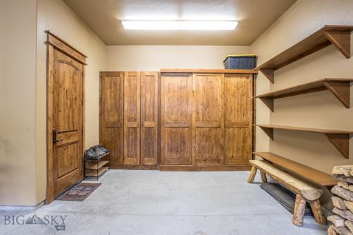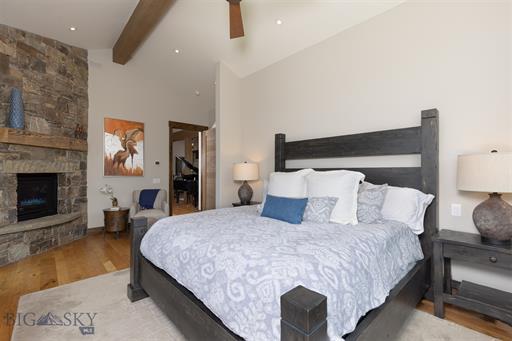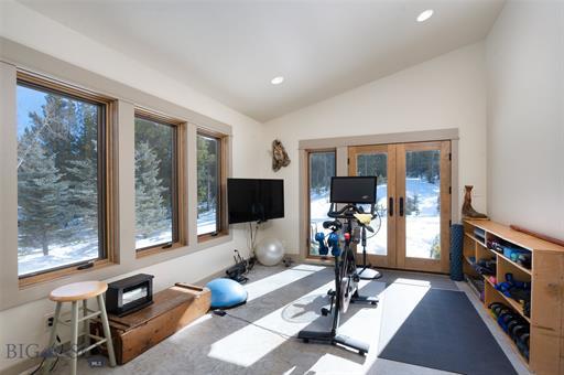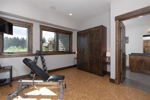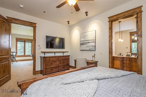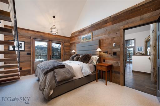 Bedroom with access to outdoor deck with hot tub and seating area. Custom closet storage. TV here.