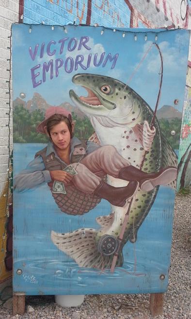 He pointed to make a quick turn into the parking lot right off Victor’s main street. We parked in a parking lot attached to a building with a large, colorful mural of a rainbow trout and a grizzly bear sharing a milkshake, an eagle flying overhead. The words painted across the top read: