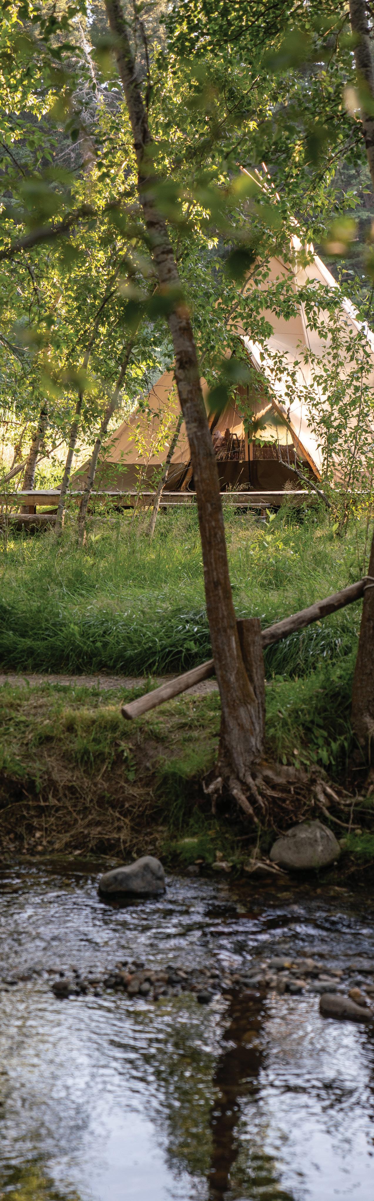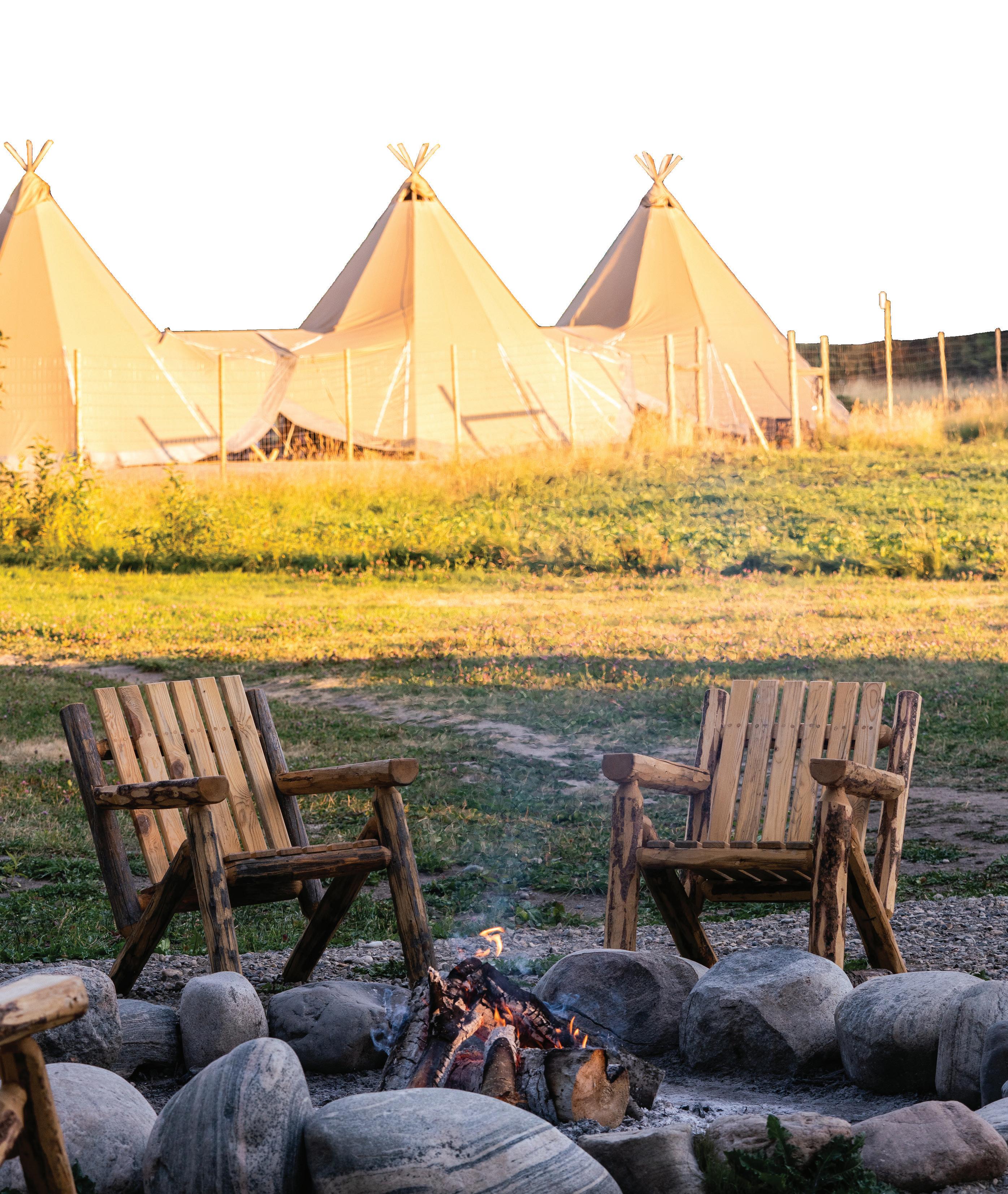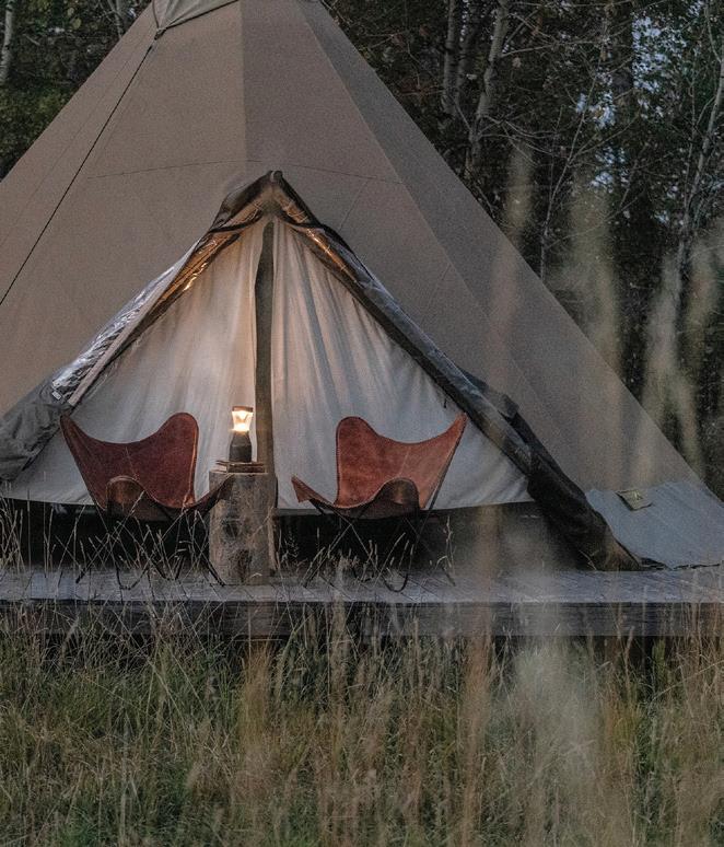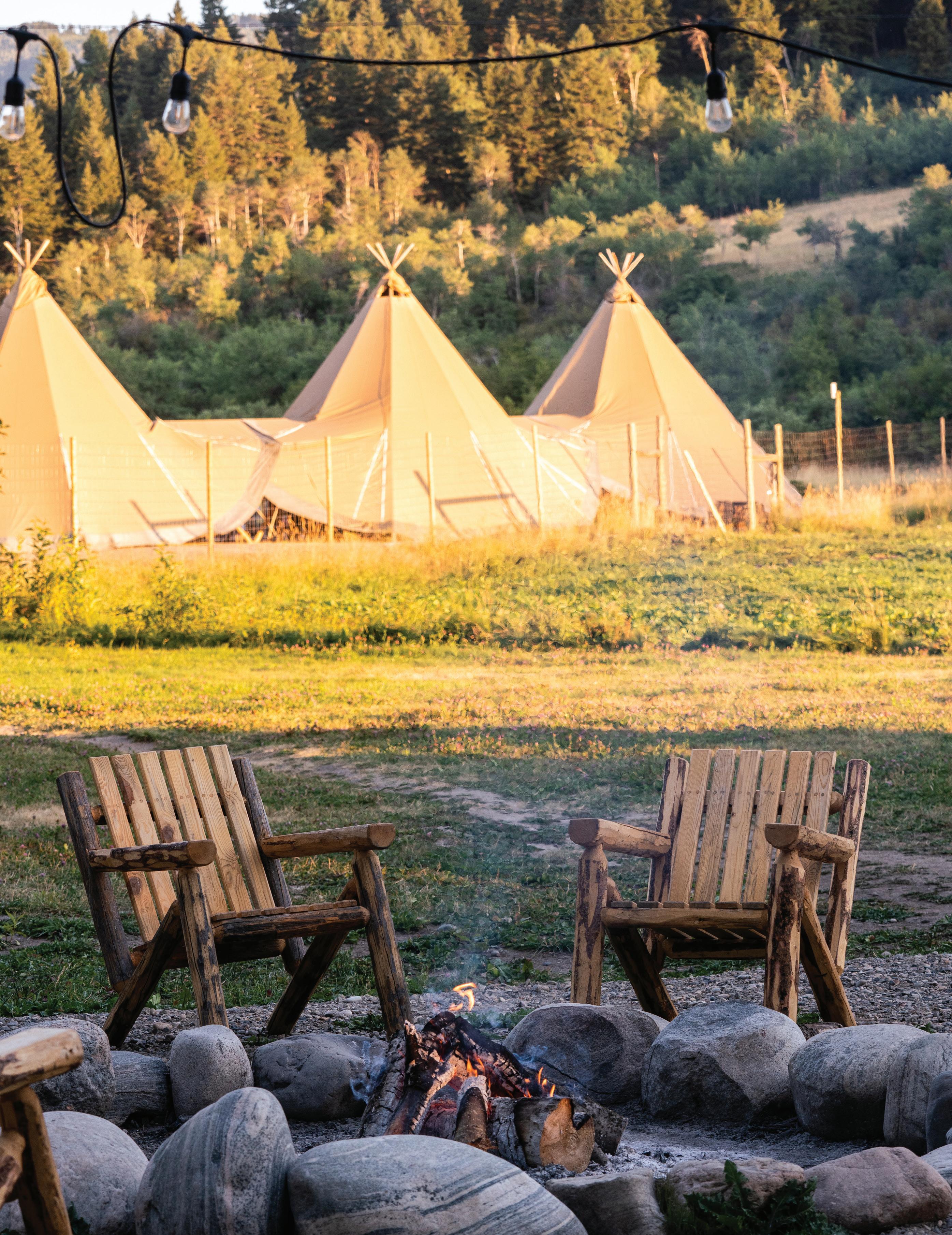 Opened in June 2020, the boutique eco-resort features nine luxurious glamping tipis for accommodations. Guests can dine at the farm-to-table wild game Field Kitchen Restaurant, housed in a large tipi and connected to a mobile kitchen. The resort offers a variety of activities, including hiking, farming, off-site fly fishing, and relaxing massages.