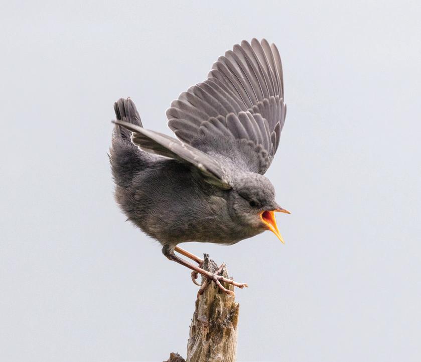 The plump, dark gray American dipper is North America’s only aquatic songbird. Often seen flying low over the water, they follow the winding course of a creek and perch themselves on rocks on the riverbanks. Aptly named, the dipper will dive into the water and use its wings to negotiate the current, swimming in search of aquatic insects. Their thick down feathers are made