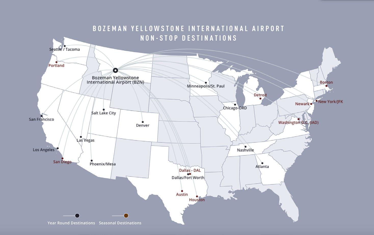 Bozeman Yellowstone International Airport has non-stop flights to 24 U.S. markets and connections all over the world