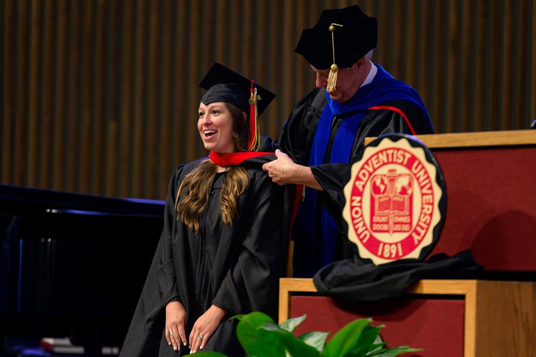 Mollie Dupper receives her graduation hood from Dr. Rich Carlson upon completing her master’s from Andrews University. Union