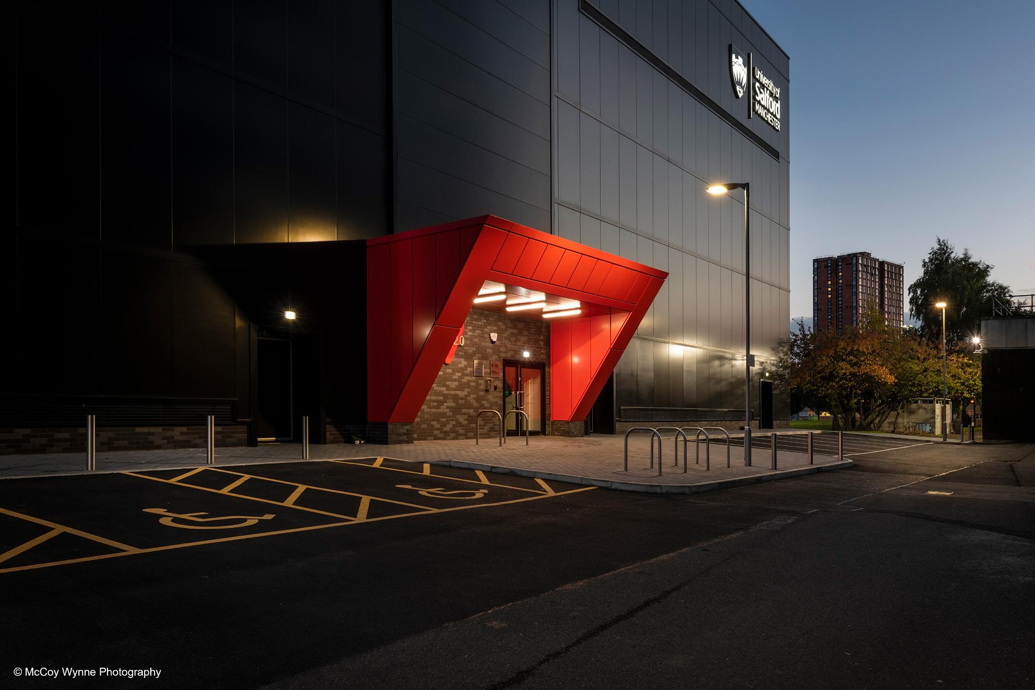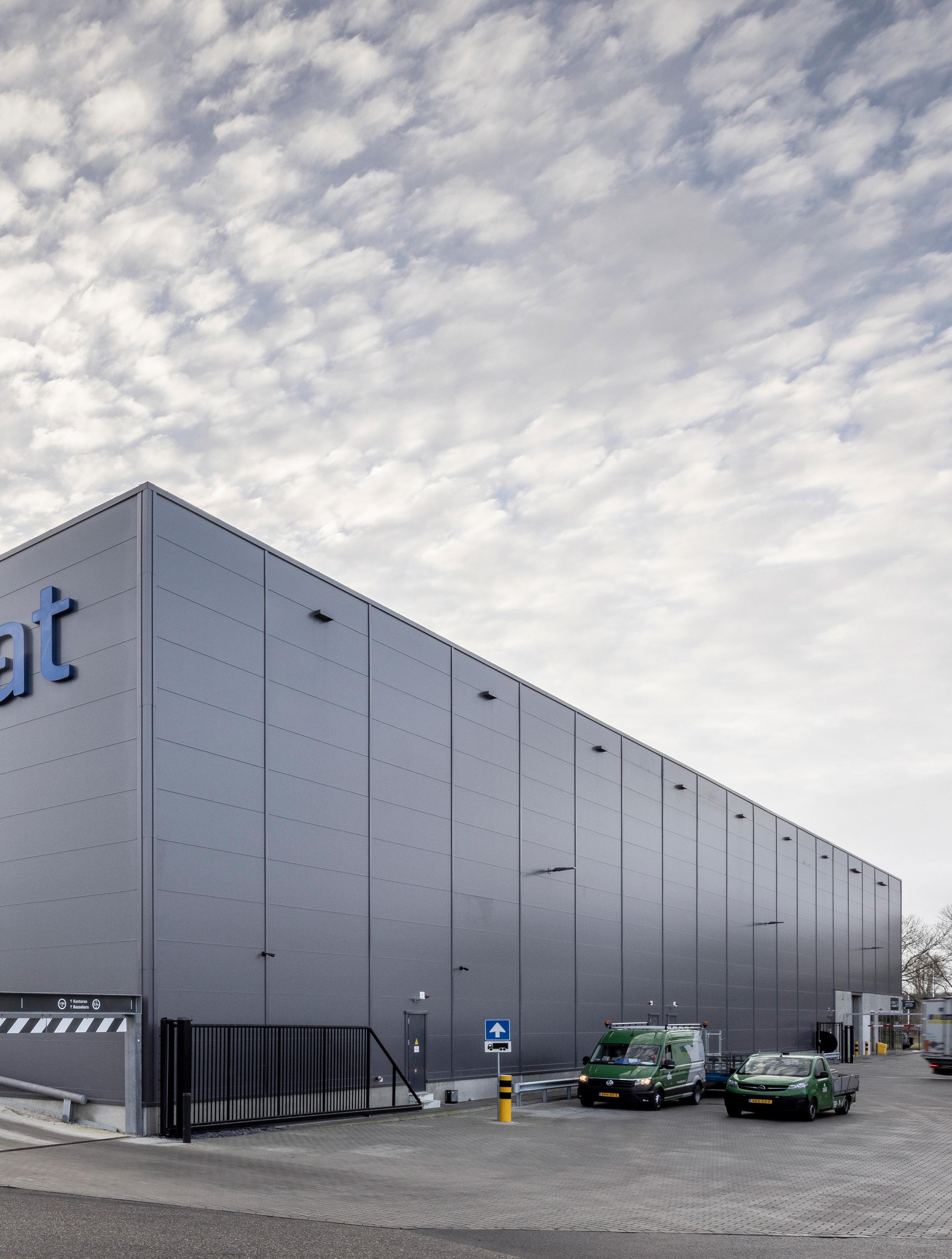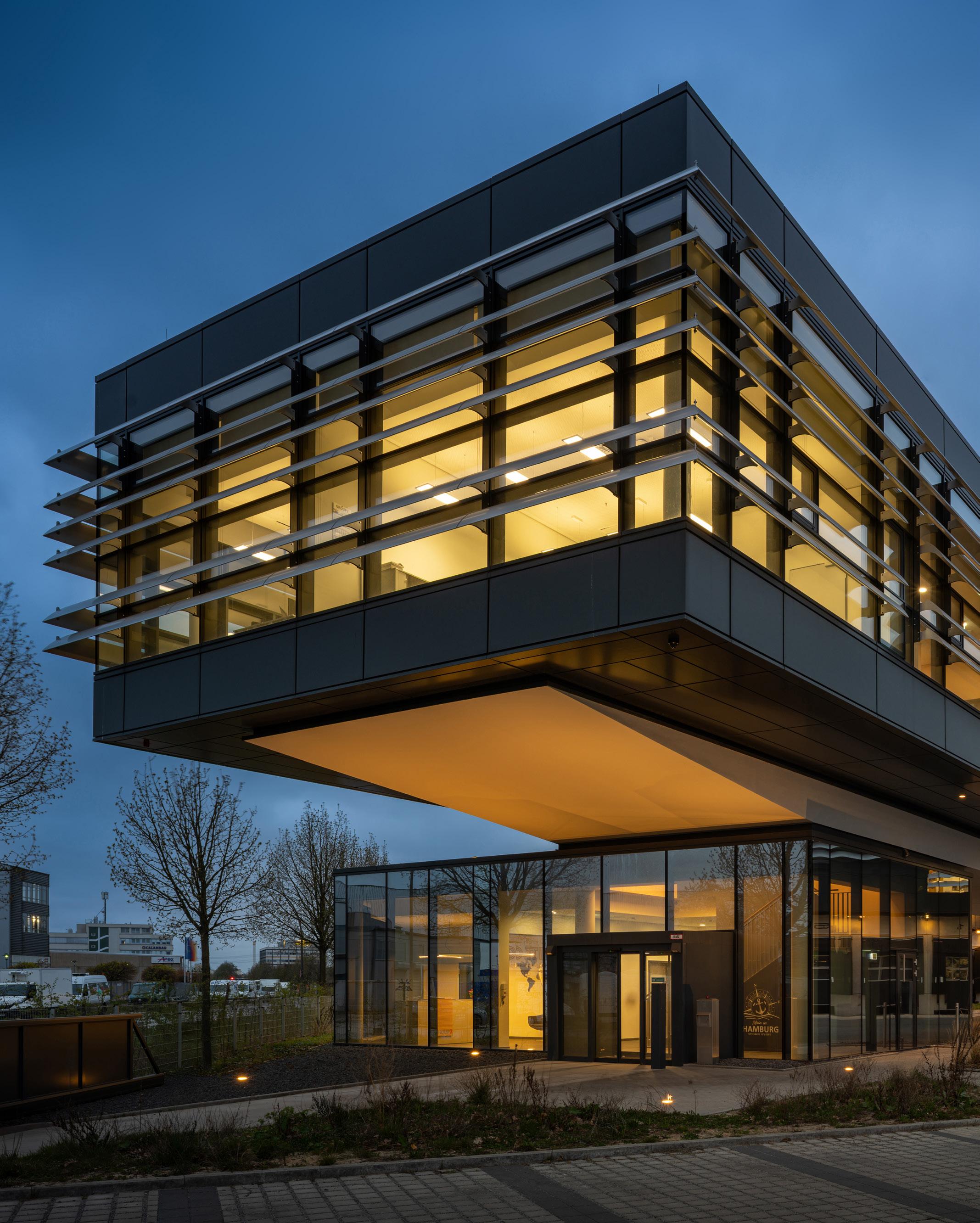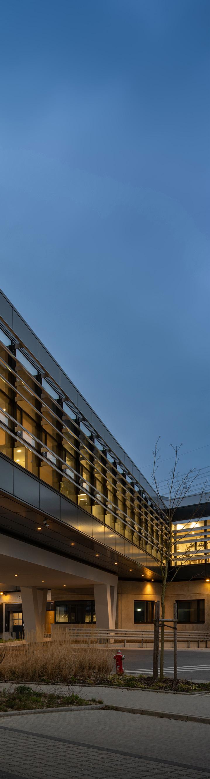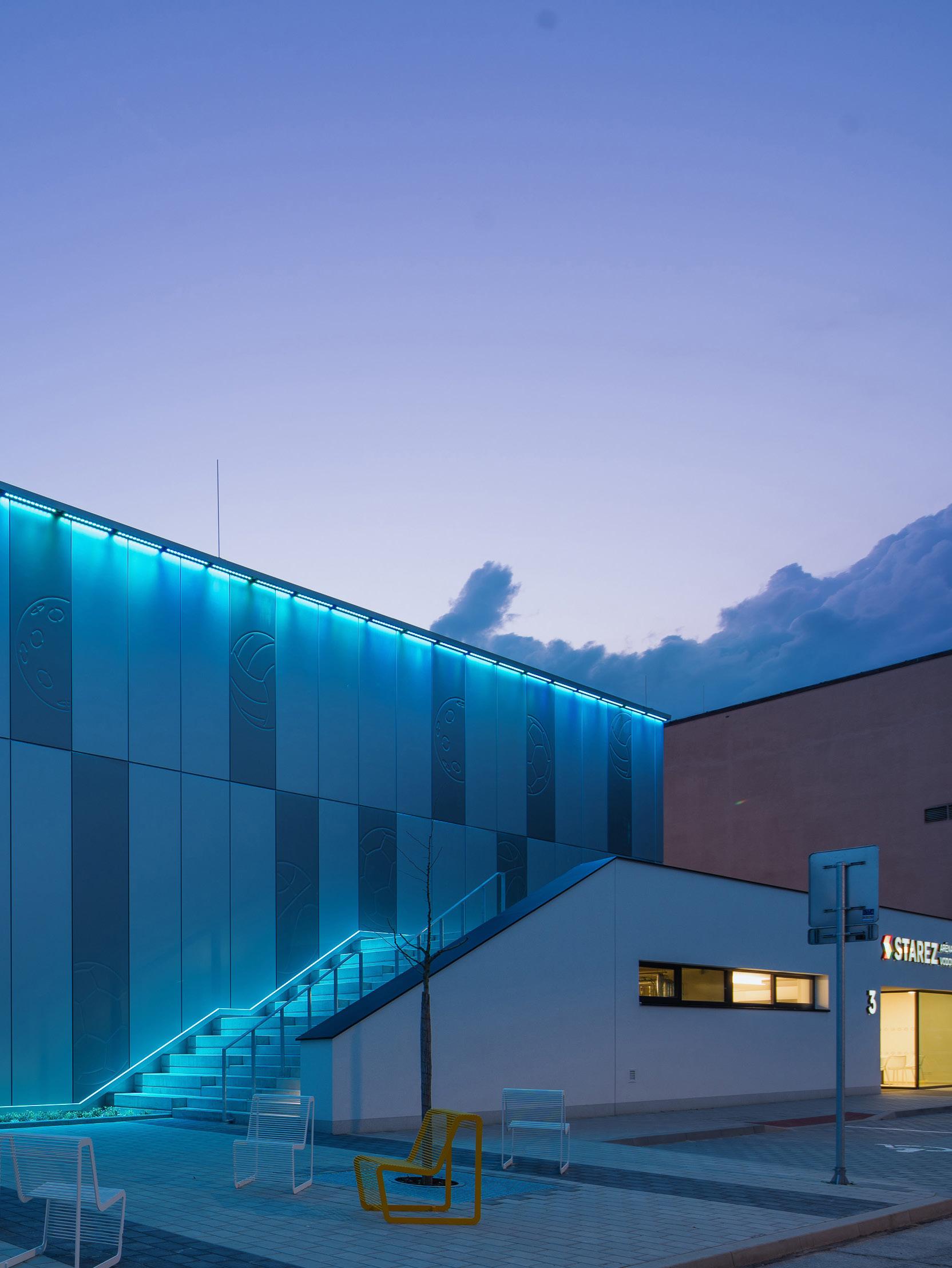 The hall incorporates advanced construction elements such as Trimo’s Qbiss One modular metal façade system.