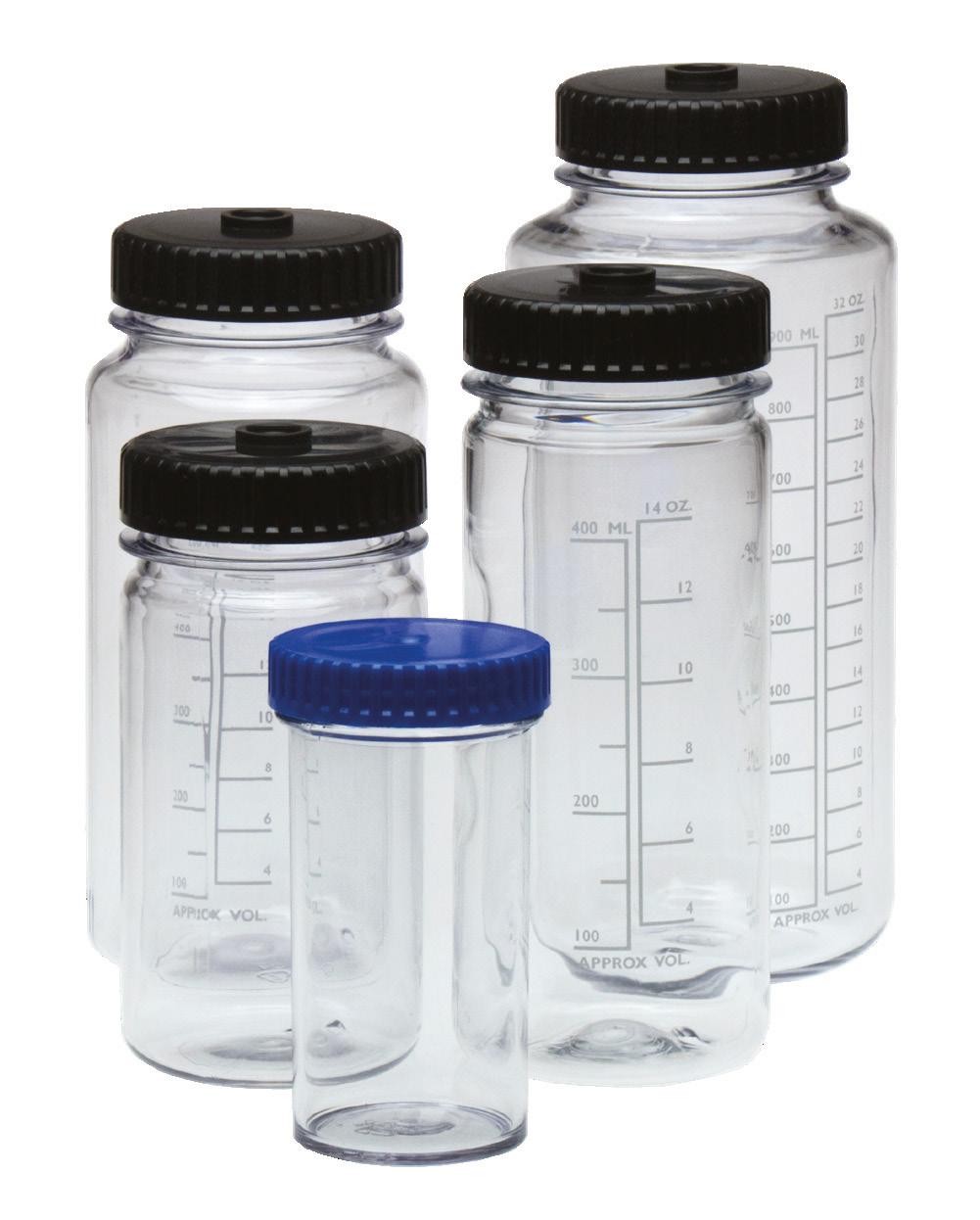 Boston Round & Wide Mouth Bottles: Space efficient, impact resistant designs for high-speed filling and storage. These are the only polycarbonate bottles on the market that can be autoclaved with the cap fully tightened while achieving SAL 10-6 sterility assurance.
