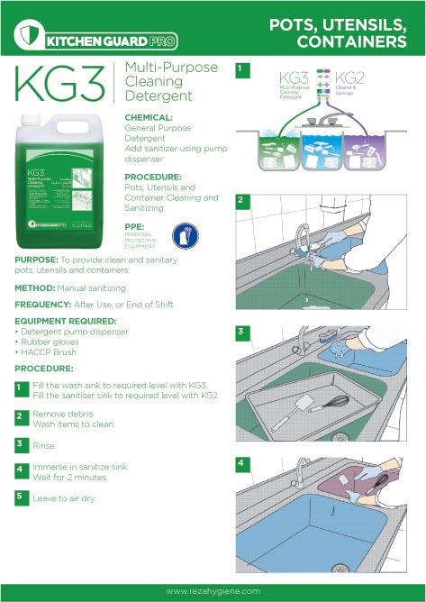 The Kitchen GuardPro range is designed around 3 core products that cover almost 95% of all cleaning needs. All of the main use chemical products come are suitable for autodosing and come complete with a complete hygiene support/training system including; PDS, MSDS, SOP’s, Point of use signage and wall charts.