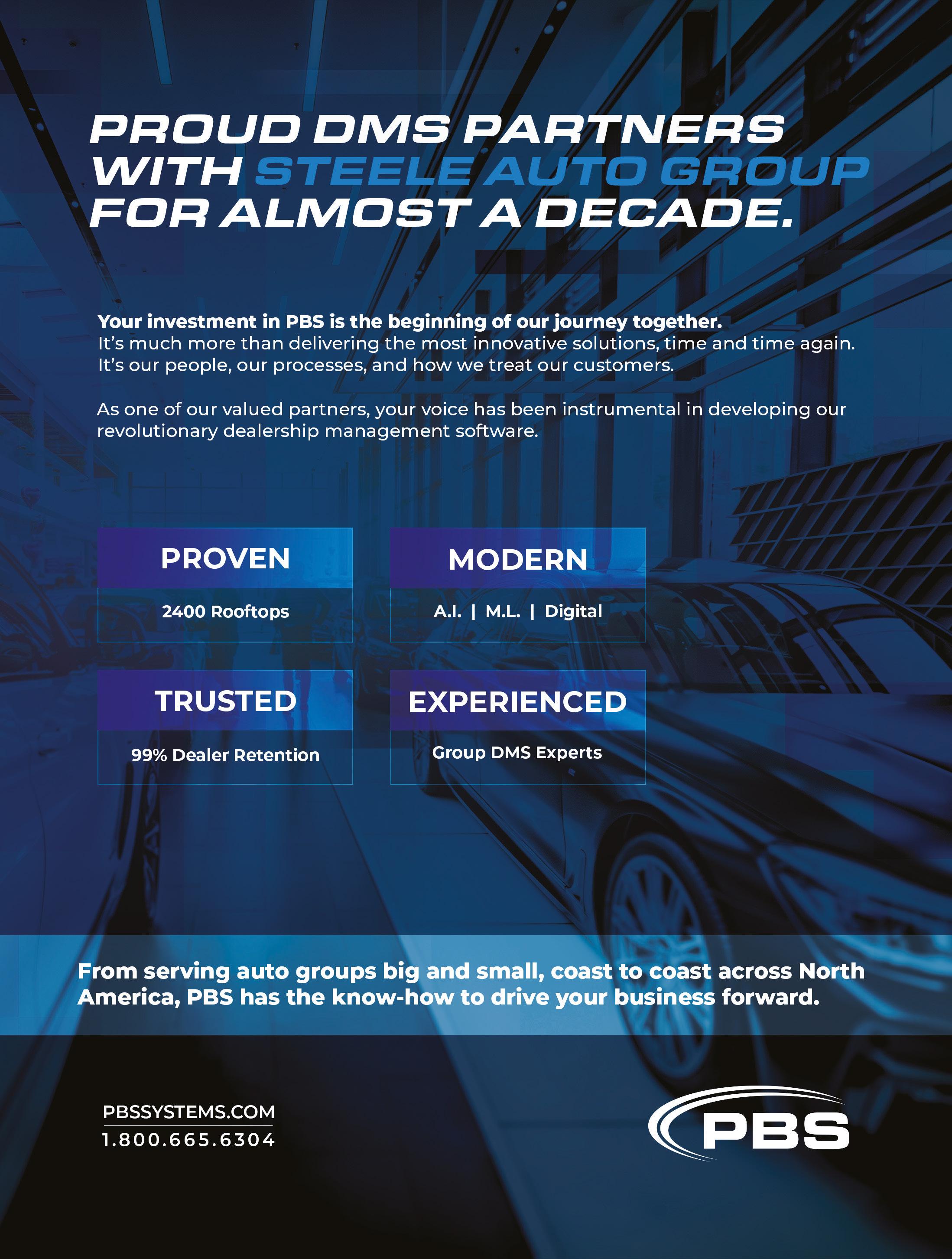 Steele Auto Group partnered with PBS Systems (PBS) as their Dealer Management System (DMS) provider in 2015. Today, they serve approximately 73 rooftops for Steele, comprising 64 of their dealerships.