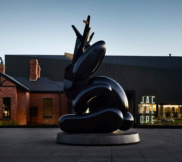 collaboration of imposing and daring construction and design of the Jackalope Hotel on the Mornington Peninsula – a blend of typologies and mythologies with an artistically otherworldly presence. However, its’ moniker and contemporary statue are from a different continent and origin. The jackalope is a mythical animal of North American folklore described as a jackrabbit with antelope horns. The word jackalope is a portmanteau of jackrabbit and antelope.