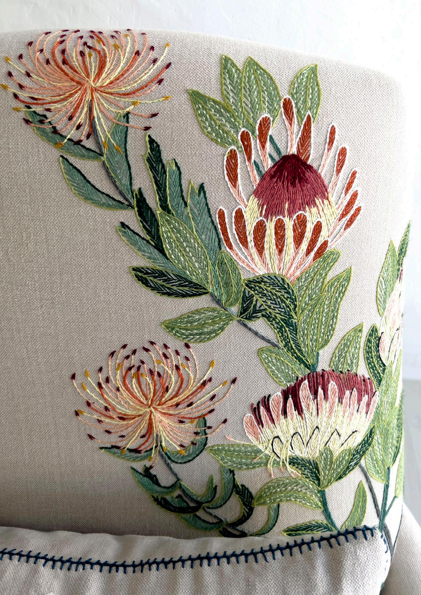 The Botanicals style is just embroidery of either fynbos, wildflowers, roots, seeds, or trees onto a plain linen or velvet. We recently did a passionfruit vine on our new shape ‘Mbotyi’.