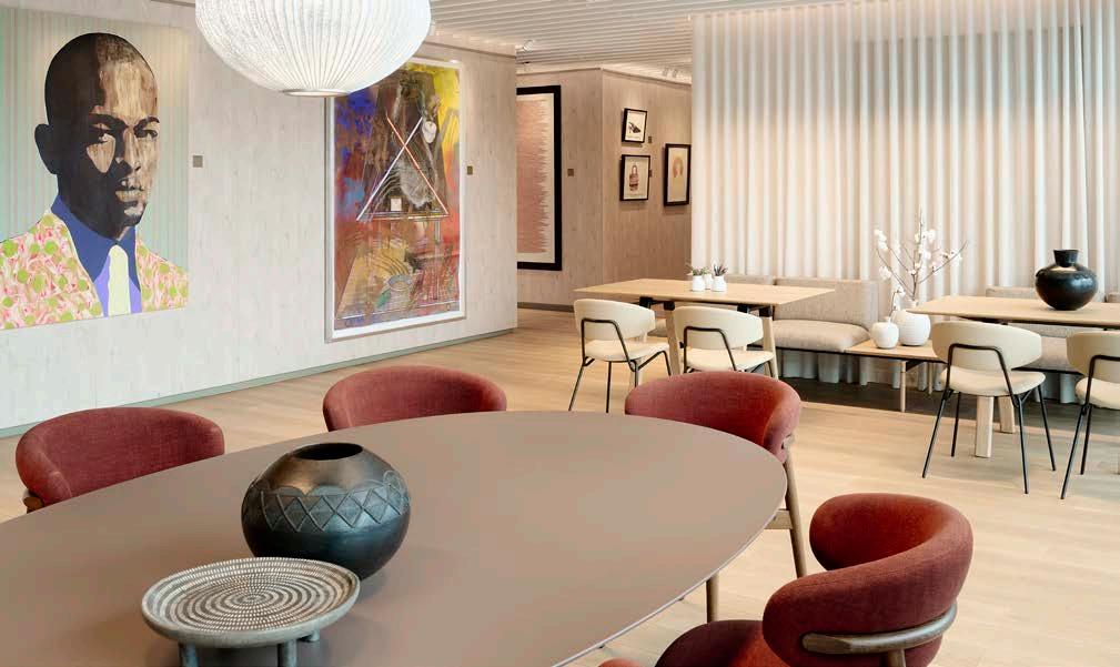 PAPER approached the selection of materials and suppliers through a carbon impact lens and a focus on principles like biophilia, wellness, and embracing local culture. As a space to be experienced with strong connections to its sense of place within South Africa, partnerships with local artists and designers were implemented. Carpet backings were made from recycled plastic, with each supplier committed to sustainable production and the potential for repurpose. Even the entrance ottomans were made from recycled plastic packets by local interior designer KeHuMile.