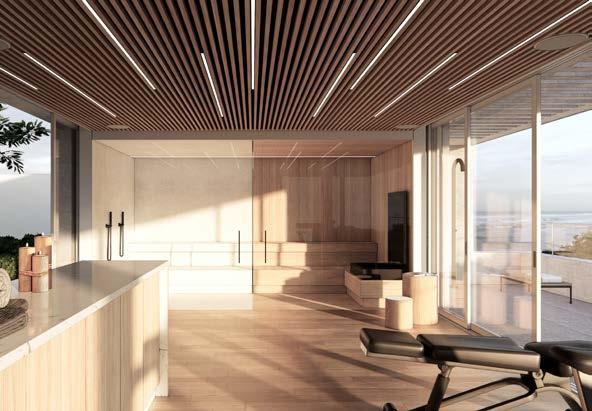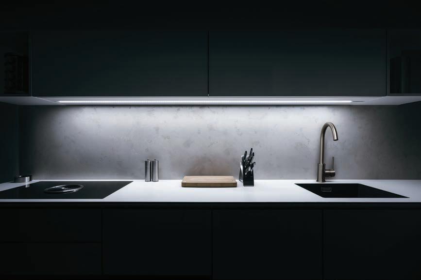 design approach adopted for Aurena is visible in the balance between colour harmony and materials. The textured wooden surface option creates a warm, welcoming atmosphere, while the white marblelook ceramic panels and the black lacquered glass create a classic, sophisticated effect.