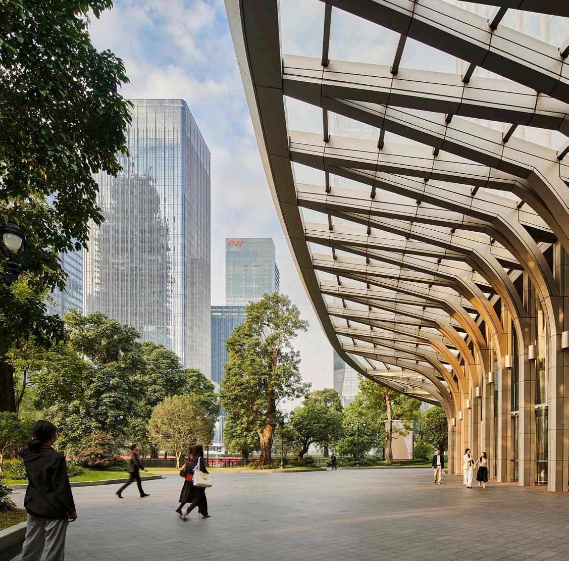 The tower, with its tapering profile that reduces wind impact, is designed and engineered to make it seamlessly efficient. To offer clear views of the Pearl River, the rounded ‘corners’ don’t use columns and as such maximise lease spans to highlight the bright floors. The façade also plays its part in the seamless efficiency of the design; individual bays are created by the pleats in the facade, which are suited to both the closed and open offices in the building. To top it off, a latticed structure at the crown of the building is home to a greenhouse. Here you’ll find an array of heritage specimen plants, with an inviting pool for the public reflected in the traditional pavilion.
