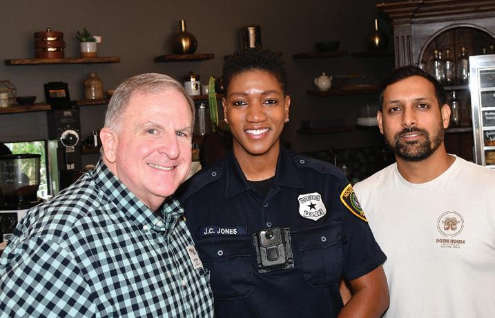 On April 22, 2025, the Greater Houston LGBTQ+ Chamber hosted Get Perk’d Up with the Chamber at Doshi House. Pictured are Jack Berger, Officer Jo Jones, and Deepak Doshi.