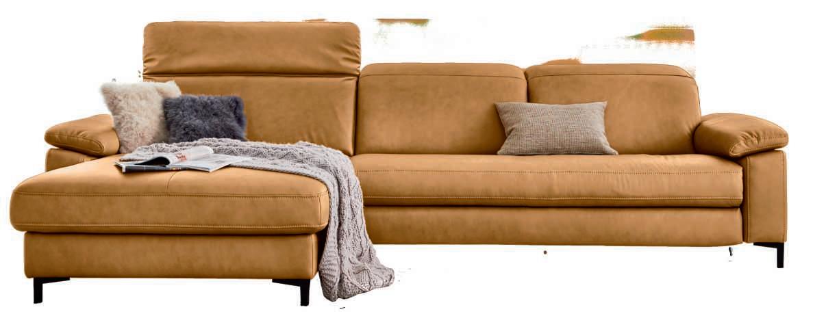 Interliving Sofa Serie 4054, Bezug Leder Longlife Vivre kurkuma, Metallfuß schwarz, best. aus: XL-Canapé mit Armlehne links und 3-Sitzer mit Armlehne rechts, Rücken Spannstoff, inklusive manueller Kopfteilverstellung an allen Elementen. Stellmaß ca. 176x347 cm. Ohne Zierkissen und Decke. M907914 208 253 6119