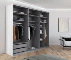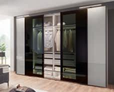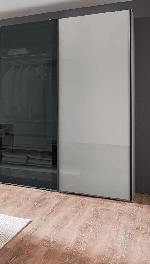 SCHWEBETÜRENSCHRANK, Korpus KieselgrauDekor, Außentüren Glas Kieselgrau, Mitteltür Parsolglas grau, Griffleisten schwarz, Mitteltüren mit Synchronöffnung, ca. B330/H236/T67 cm. Wiemann Dubai