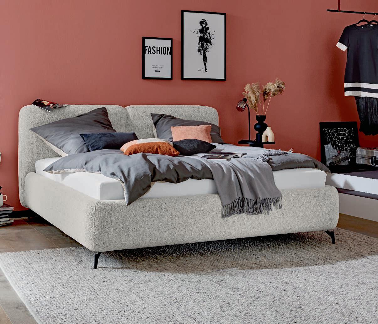 Gestalte mich nach deinen Wünschen – ich bin ein Boxspringbett mit vielen Gesichtern: Stelle dir aus 4 Kopfteilen, 2 Unterbauten, 3 stoffbezogenen Matratzen, 4 Toppern und 3 Fußvarianten einfach dein Traumbett zusammen!