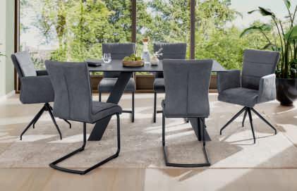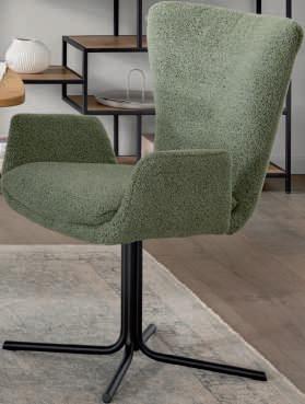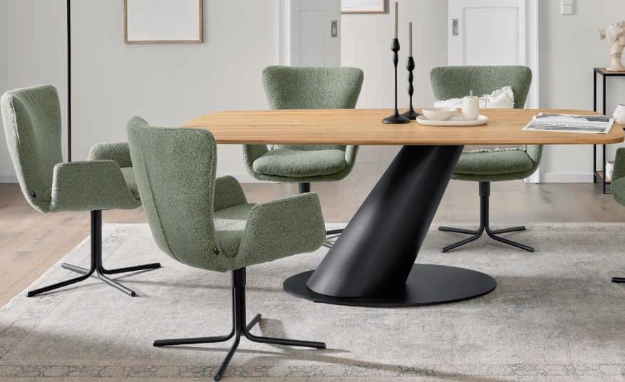 Interliving Esszimmer Serie 5121 - Design-Esstisch, Charakter-Eiche massiv geölt, Plattenformat mit Soft-Ecken, konische Säule auf ovaler Bodenplatte, Metall schwarz, ca. 200x100 cm. Design-Armlehnenstuhl, Bezug Stoff Alpine thyme, Stahl schwarz lackiert, 360° drehbar mit Rückholfunktion, Bezug: 100% Polyester. M941005 210 399 3900