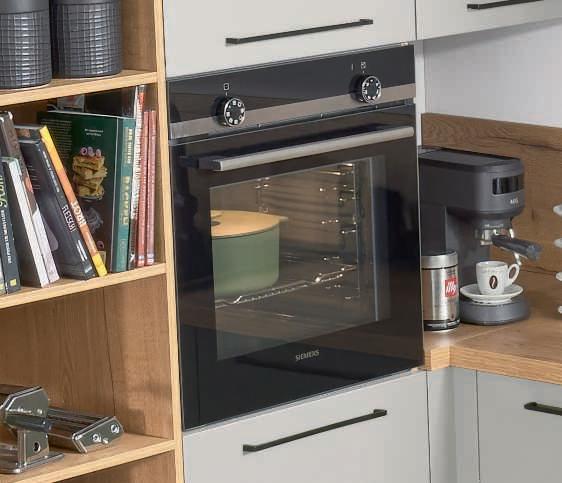 Die Interliving Küche Serie 3086 umfasst hochwertige Siemens Elektrogeräte: das autarke Glaskeramik-Kochfeld ET645HE17, den Backofen HB510ABR1 und den iQ100 Kühlschrank inkl. Gefrierfach KI32LNSE0.