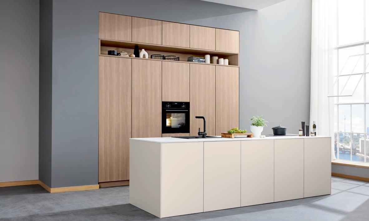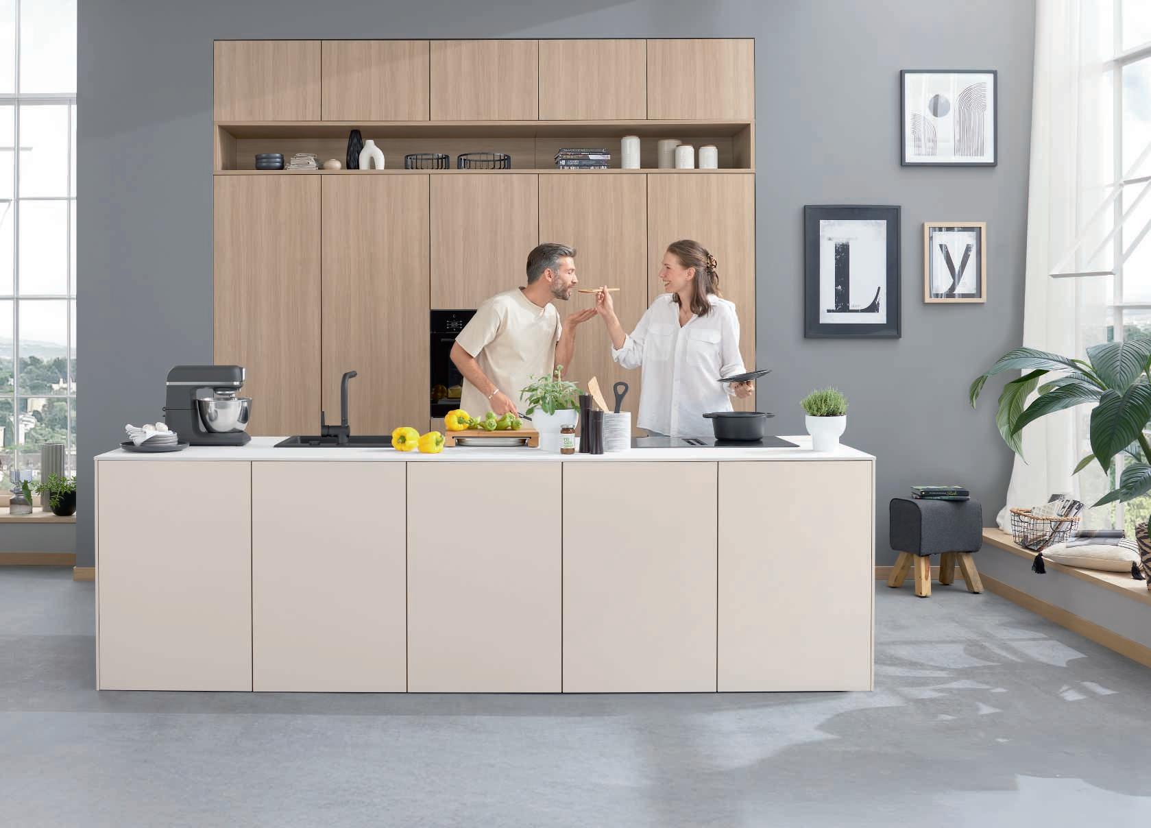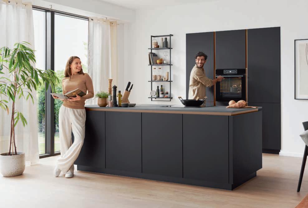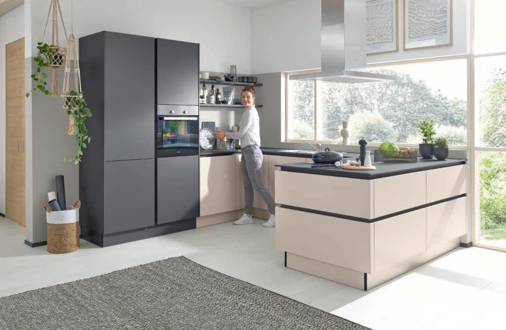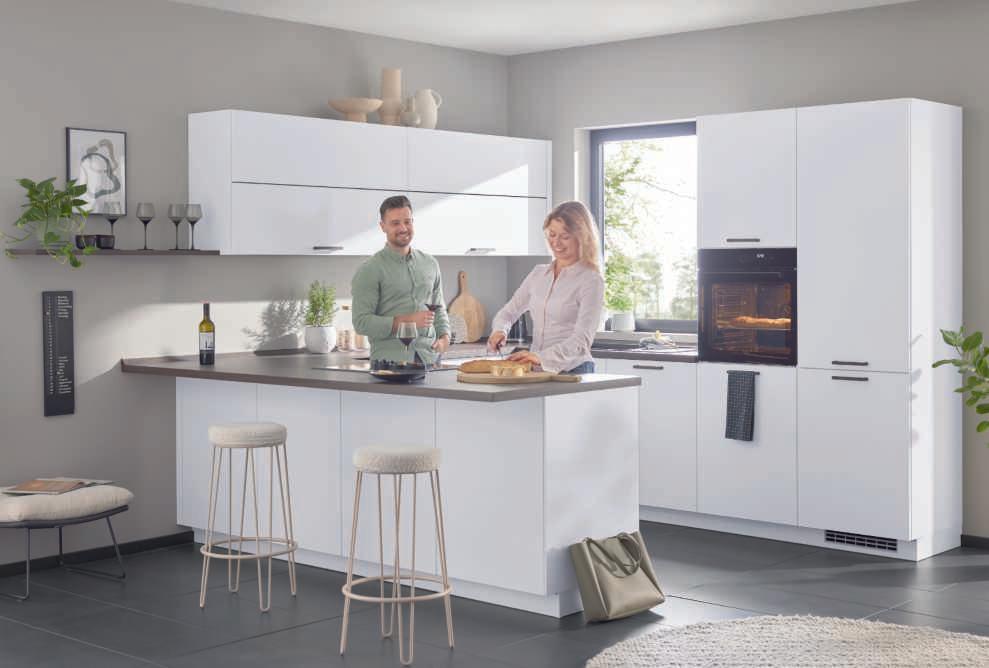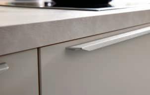 Elegante Fronten mit edelstahlfarbigen Griffleisten unterstreichen das hochwertige Design.