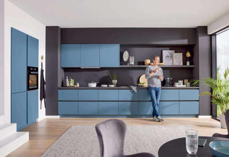 WERT-KÜCHE aus dem Programm Mattea Colour, Front UV-Lack stahlblau matt, Griffmulde lavaschwarz matt, Arbeitsplatte und Boards in Corten Oxid Nachbildung, best. aus Küchenzeile mit Hängern und separatem Hochschrankelement. Mit Elektrogeräten von Miele und Einbauspüle. Maße ca. 420 + 120 cm. Ohne Deko. M880803 217 374 0122