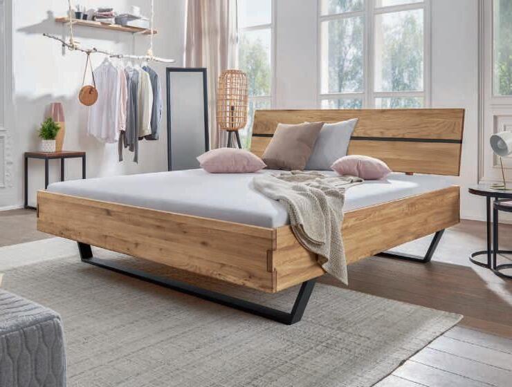 Gestell Wildeiche massiv hell geölt, Kopfteil mit schwarzer Lisene und Metallkufe schwarz, Liegefläche ca. 180x200 cm.