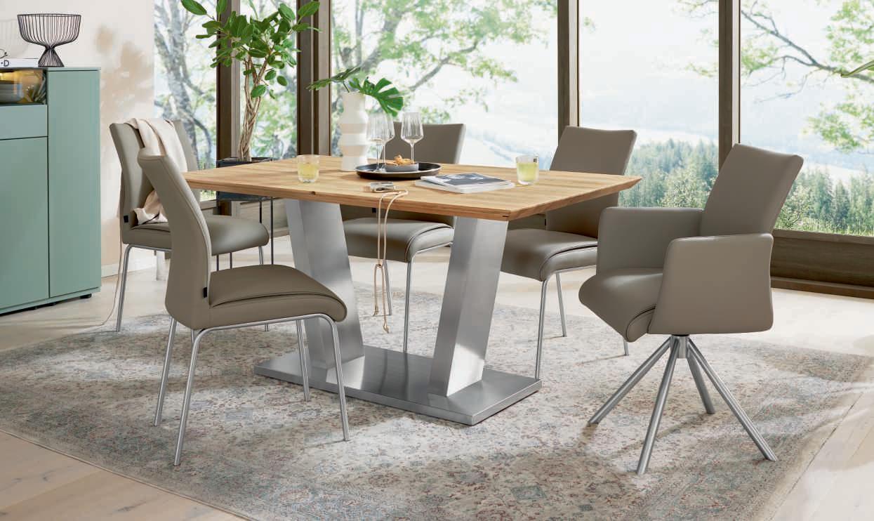 4I Interliving Esszimmer Serie 5122 - Esstisch, Platte Wildeiche hell massiv, mit Schweizer Kante, Säulengestell Edelstahl gebürstet, ca. 160x90 cm. 5I Polsterstuhl und 6I Armlehnstuhl, Bezug LEA-TEX Kunstleder schlammfarben, Gestell Edelstahl gebürstet. Bezug: 75% Polyester, 20% Polyurethan, 5% Calciumcarbonat. 6I Armlehnstuhl, Stativgestell mit Dreh-/ Rückstell- und Motionfunktion.
