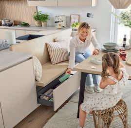 Die integrierte Sitzbank mit Schubladen bietet zusätzlichen Stauraum und schafft zusammen mit dem chicen Esstisch einen gemütlichen Sitzplatz in der Küche.