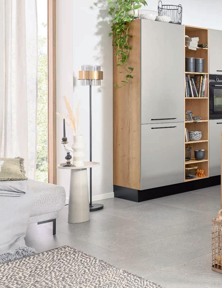 Interliving Küche Serie 3085. Erhältlich bei allen Interliving Einrichtungshäusern. Preis inkl. MwSt., zzgl. Lieferung und Montage. Weitere Produkte und Dekorationen auf dem Bild (z.B. Vasen, Körbe, Töpfe, Tablets und Gläser) sind nicht im Preis inbegriffen.