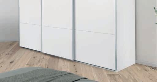SCHWEBETÜRENSCHRANK, 3-türig, Front und Korpus alpinweiß, inkl. Inneneinteilung mit 2 Schubkästen, Kleiderstange und 3 Fachböden, ca. B271/H223/T68 cm.