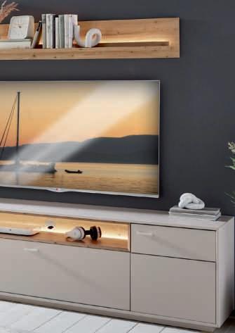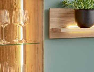 Ich bringe Licht ins Spiel: mit LED-Beleuchtung, Nischen-, Rückwand- und Fachbeleuchtung –steuerbar per Funk-Fernbedienung. Meine Fronten gibt es in Alteiche- oder NaturbucheNachbildung.