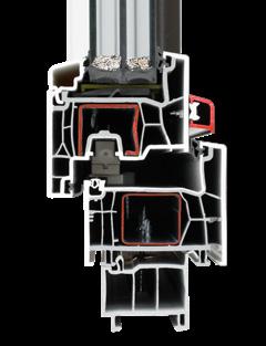 Querschnitt des Fensterprofils mit AD 76 mm Bautiefe für den Sanierungsbereich; ebenso auch als Standardprofil mit MD 88 mm Bautiefe erhältlich.