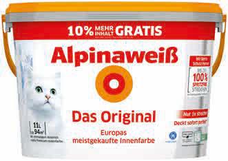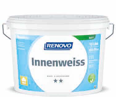 Matte Innenfarbe, gute Deckkraft, Deckvermögen Kl. 2 (7 m²/L), Nassabriebbeständigkeit Kl. 4, weiß. 10 L. Art.-Nr. 820197