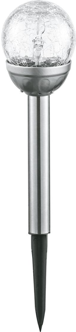 IP44, Betriebsdauer bis zu 8 Std., RGB, Krakelee-Optik, mit Erdspieß, Dämmerungssensor, Ein-/Ausschalter, Glas/Edelstahl/ Kunststoff, silber. Ca. Ø 8 x H 37 cm. Inkl. LED-Modul und Akku.