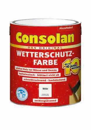 Bis zu 10 Jahre Wetterschutz, hochdeckend, schnelltrocknend, seidenglänzend, für außen, weiß. 2,5 L. Versch. Farben. Art.-Nr. 840058