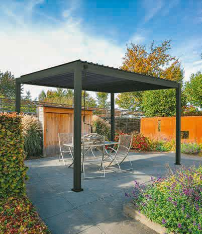 Stahllamellendach mit verstellbarem Öffnungswinkel als Sonnen-, Windund Regenschutz, Gestell aus Aluminium, anthrazit.